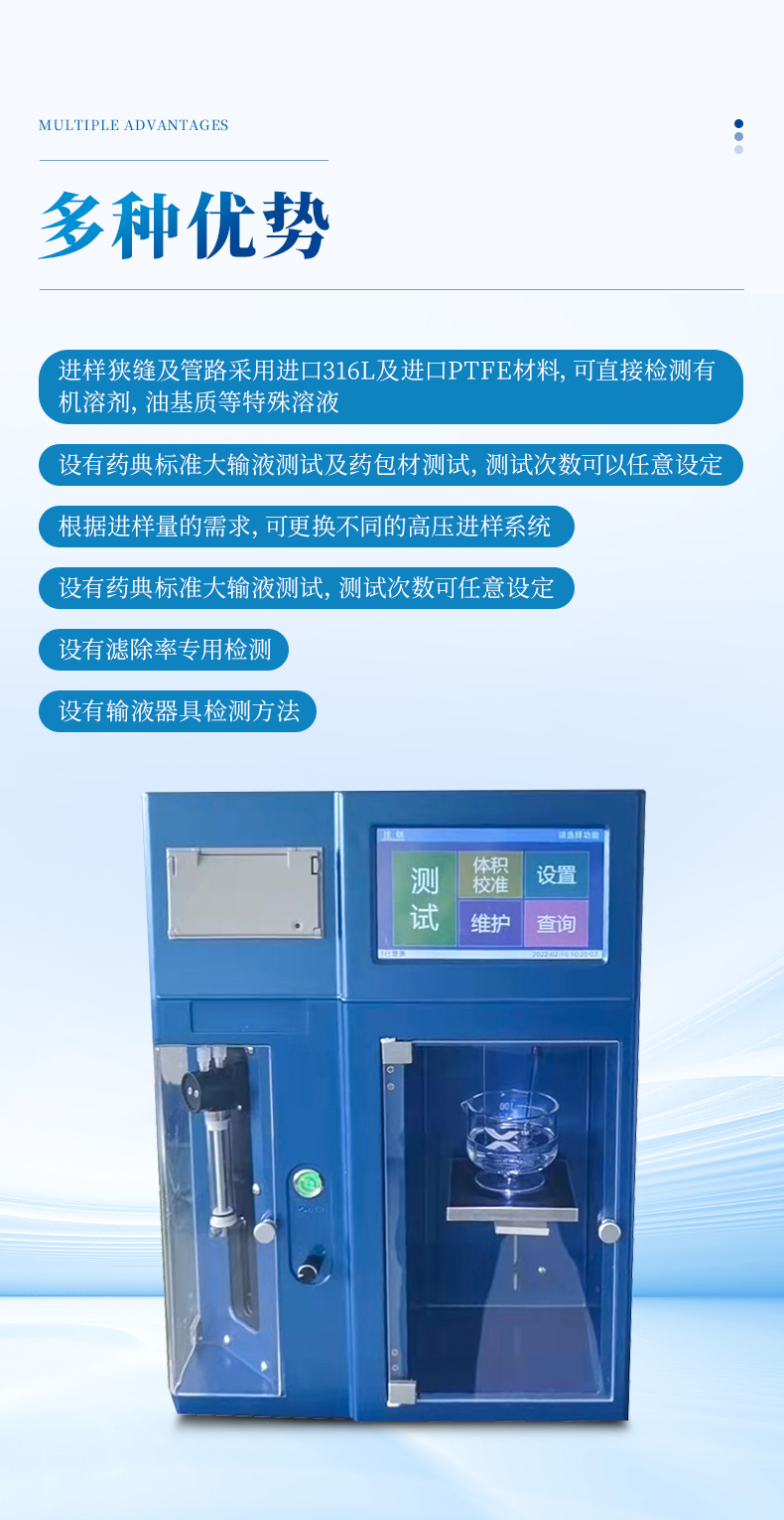 ●滿足《中國(guó)藥典》可直接檢測(cè)注射液、無菌粉、輸液器具及藥包材的不溶性微粒含量及大小