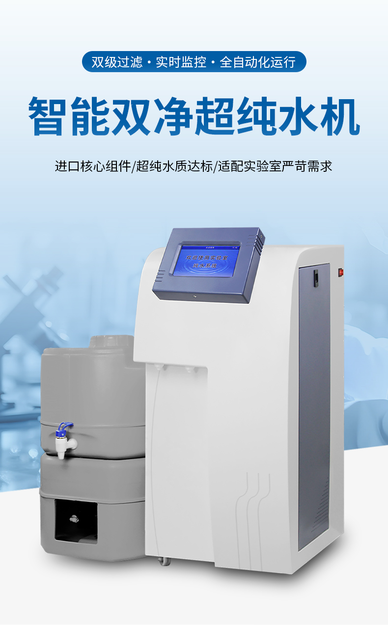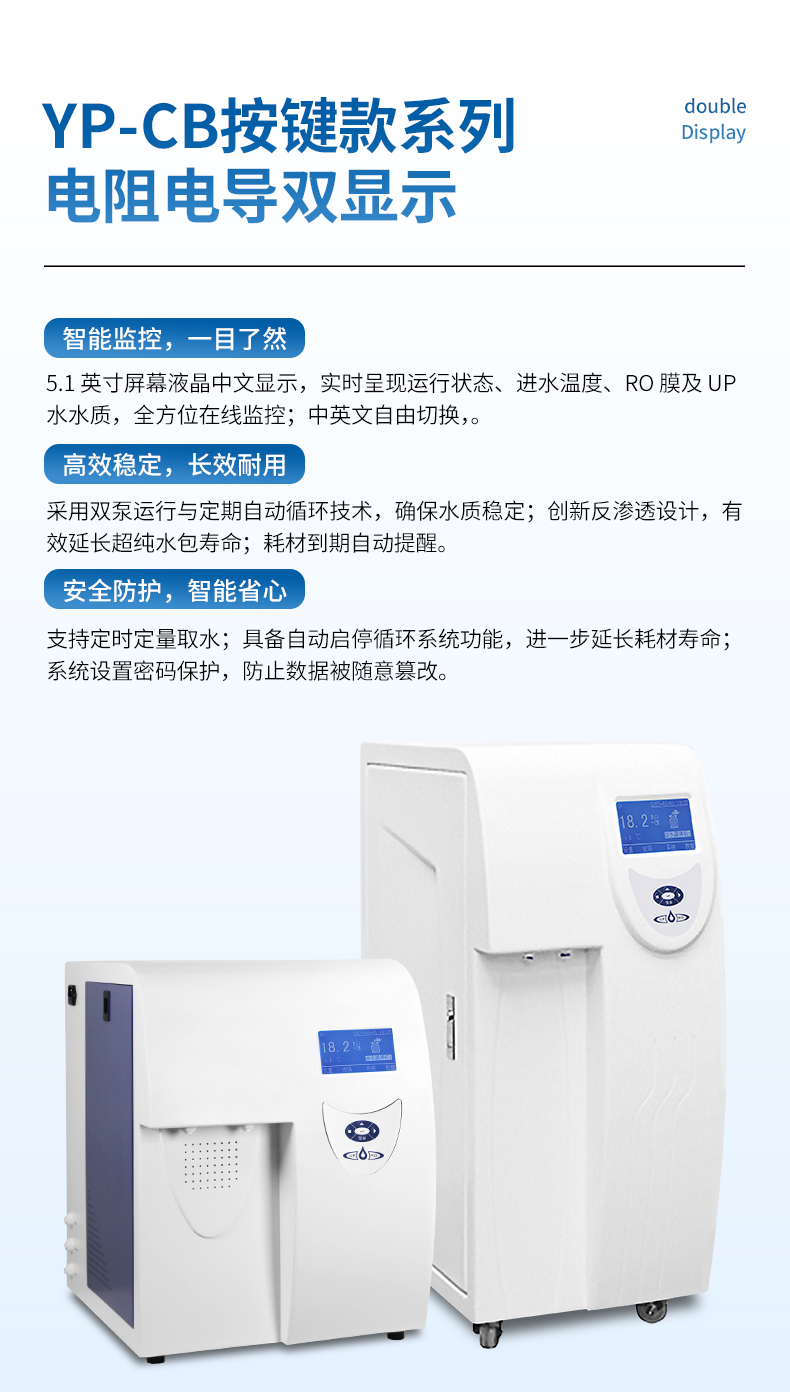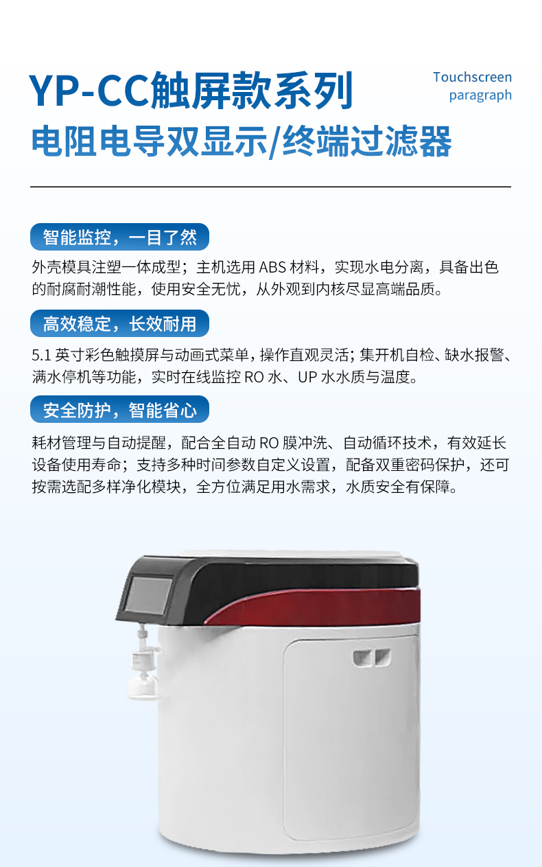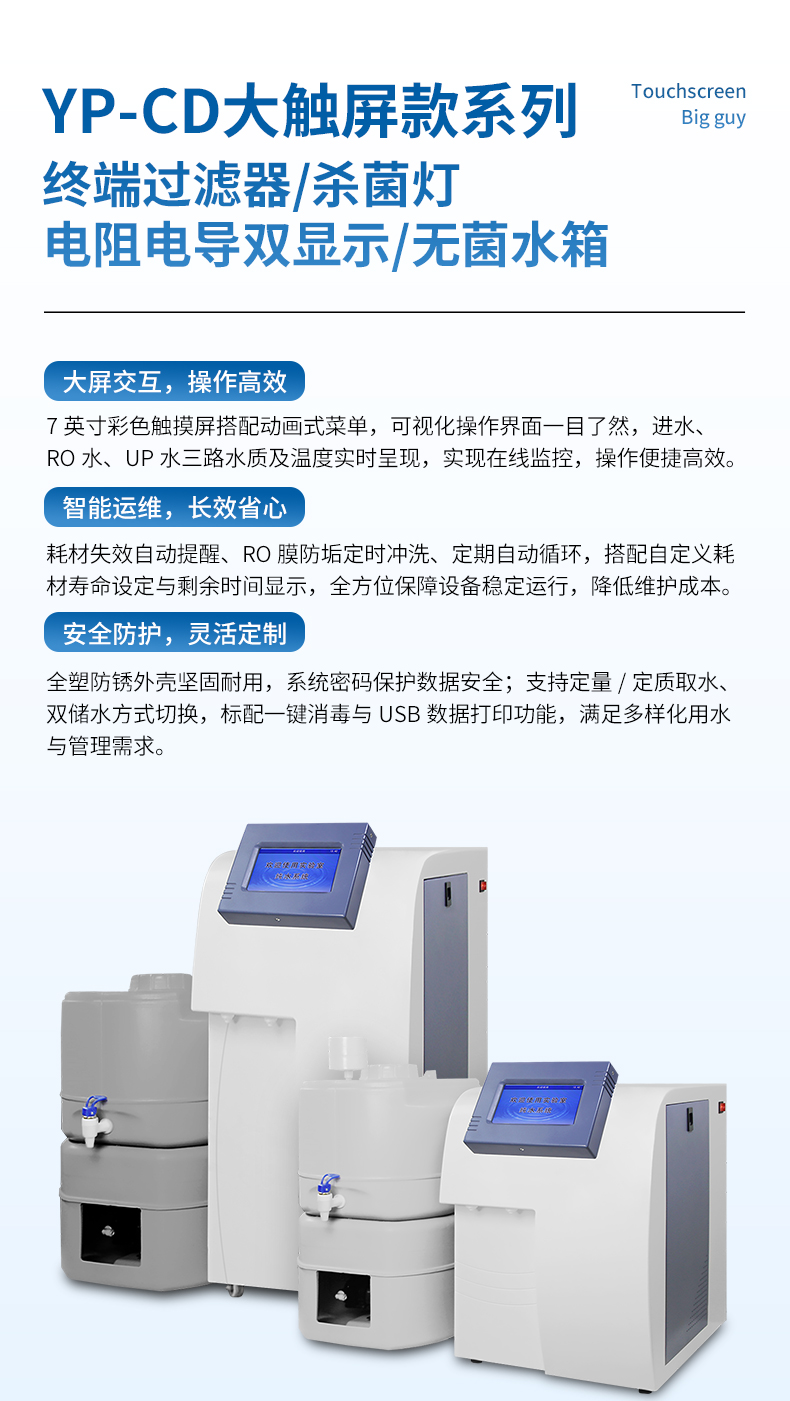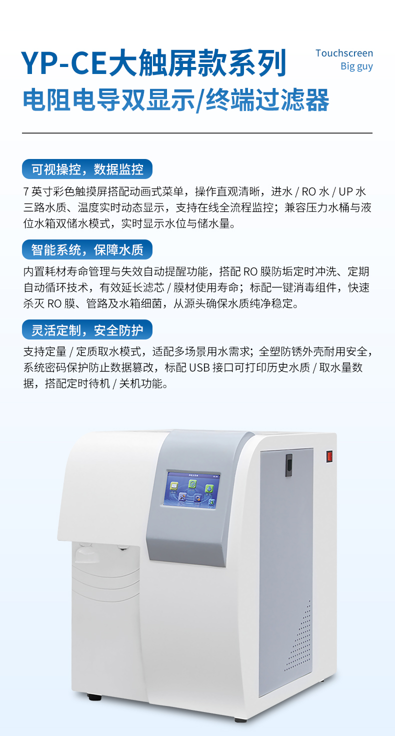【產(chǎn)品簡介】觸屏款,產(chǎn)水量10L/h,電阻電導(dǎo)雙顯示,耗材到期提醒,配終端過濾器