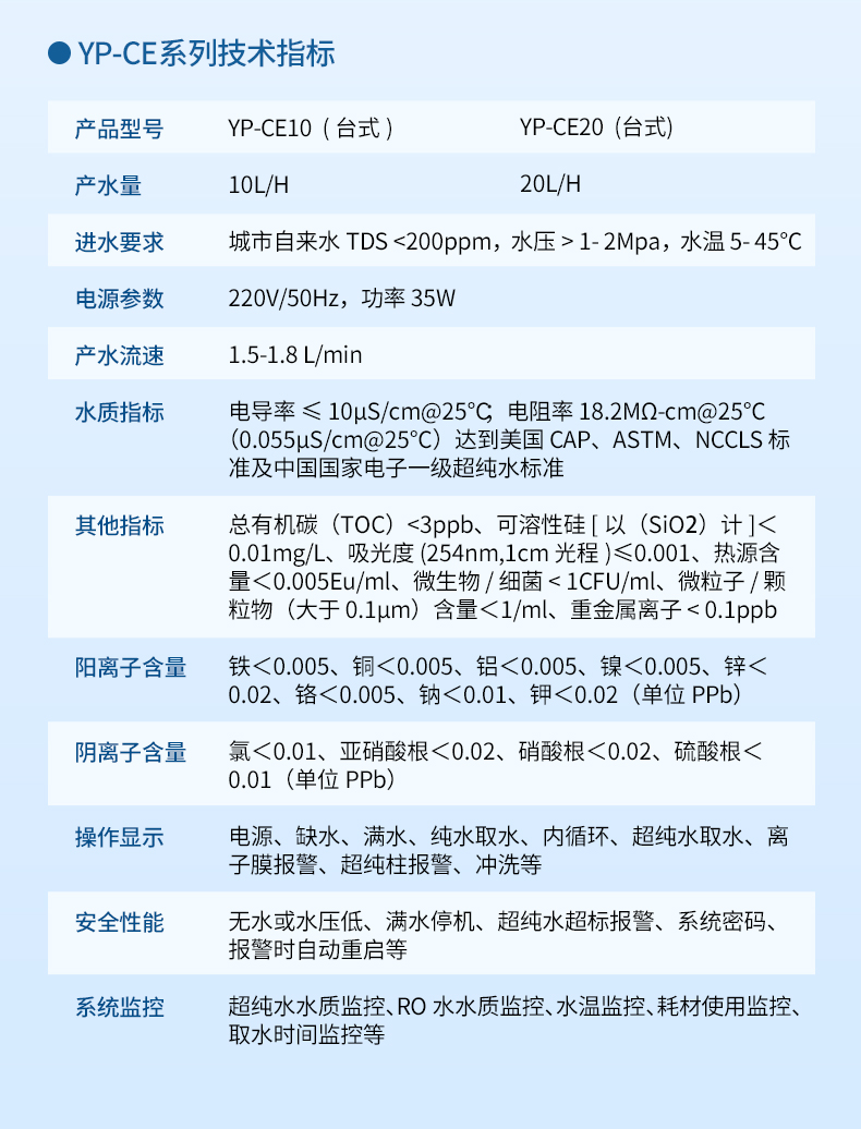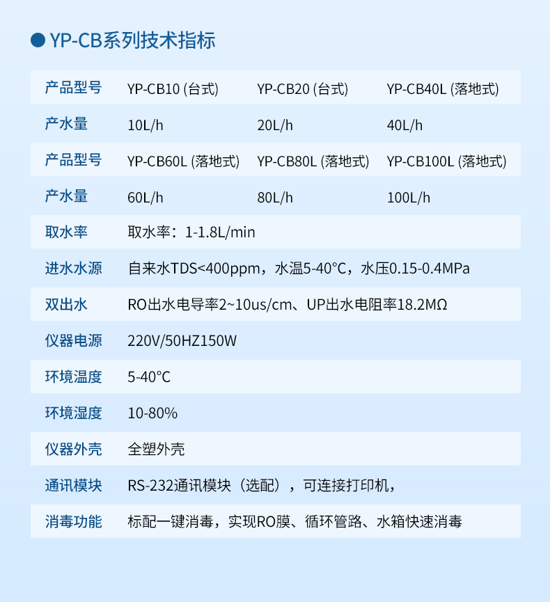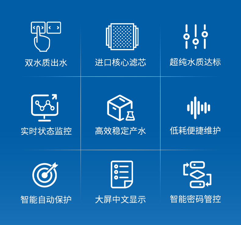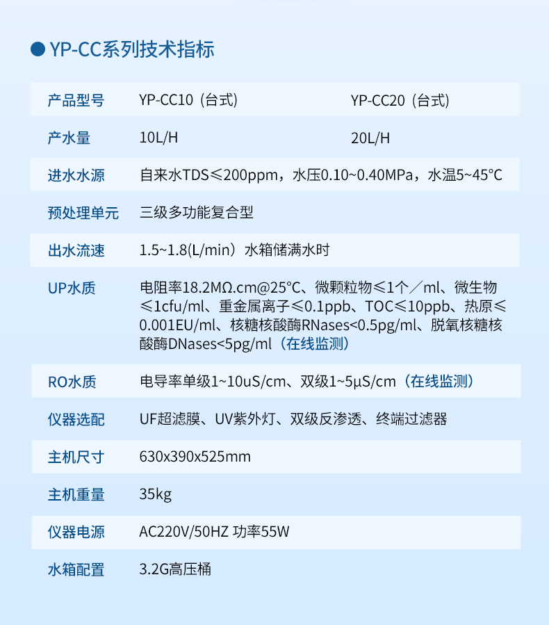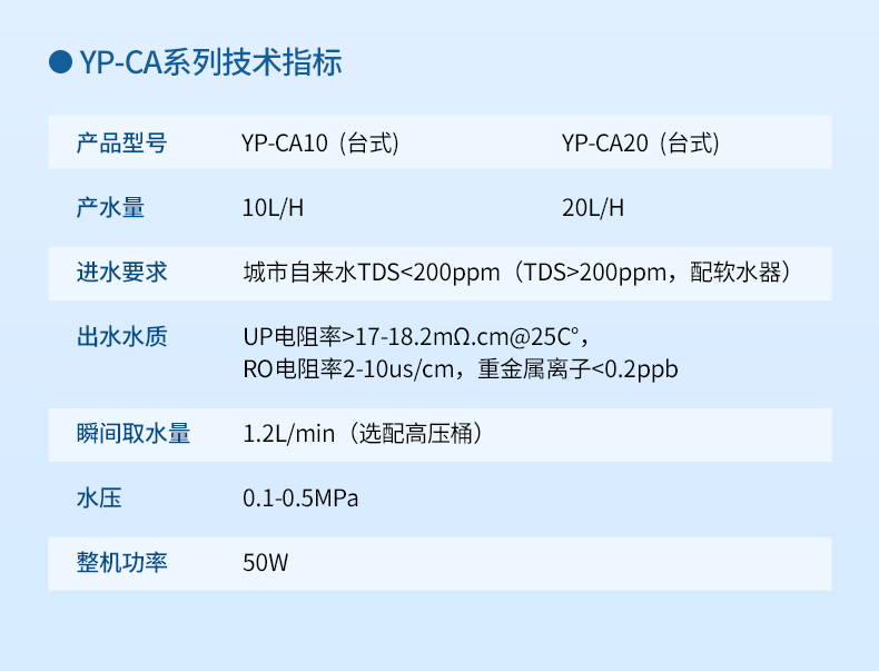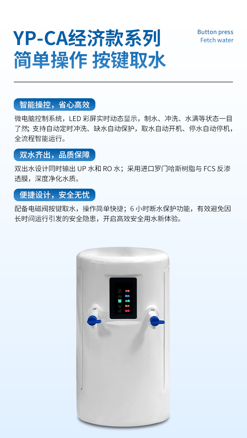 【產(chǎn)品簡介】觸屏款,產(chǎn)水量10L/h,電阻電導(dǎo)雙顯示,耗材到期提醒,配終端過濾器