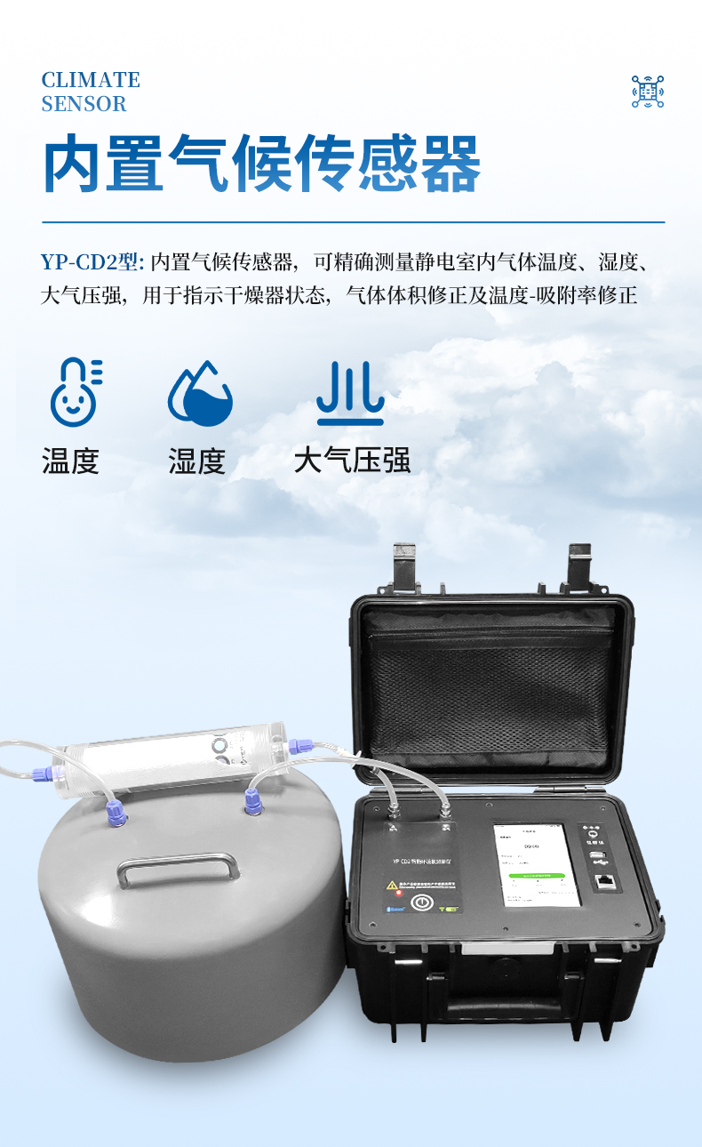內(nèi)置氣候傳感器,可精確測(cè)量靜電室內(nèi)氣體溫度、溫度、大氣壓強(qiáng),用于指示干燥器狀態(tài),氣體體積修正及溫度-吸附率修正。