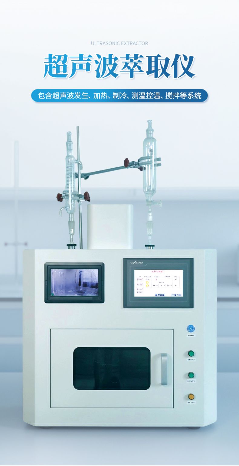 超聲波萃取儀使用超聲波技術(shù)然后結(jié)合運(yùn)用低溫恒溫系統(tǒng)作為輔助,整套系統(tǒng)包含大功率超聲波 發(fā)生系統(tǒng)、加熱系統(tǒng)、壓縮機(jī)制冷系統(tǒng)、測(cè)溫控溫系統(tǒng)、攪拌系統(tǒng)等,在能控制反應(yīng)體系溫度的 條件下,能有效促進(jìn)反應(yīng)物的高效率混合及促進(jìn)催化化學(xué)反應(yīng)。