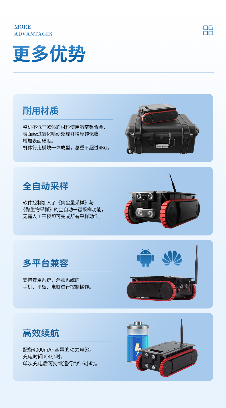 高效續(xù)航:配備4000mAh容量的動(dòng)力電池,充電時(shí)間≤4小時(shí),單次充電后可持續(xù)運(yùn)行約5-6小時(shí)。