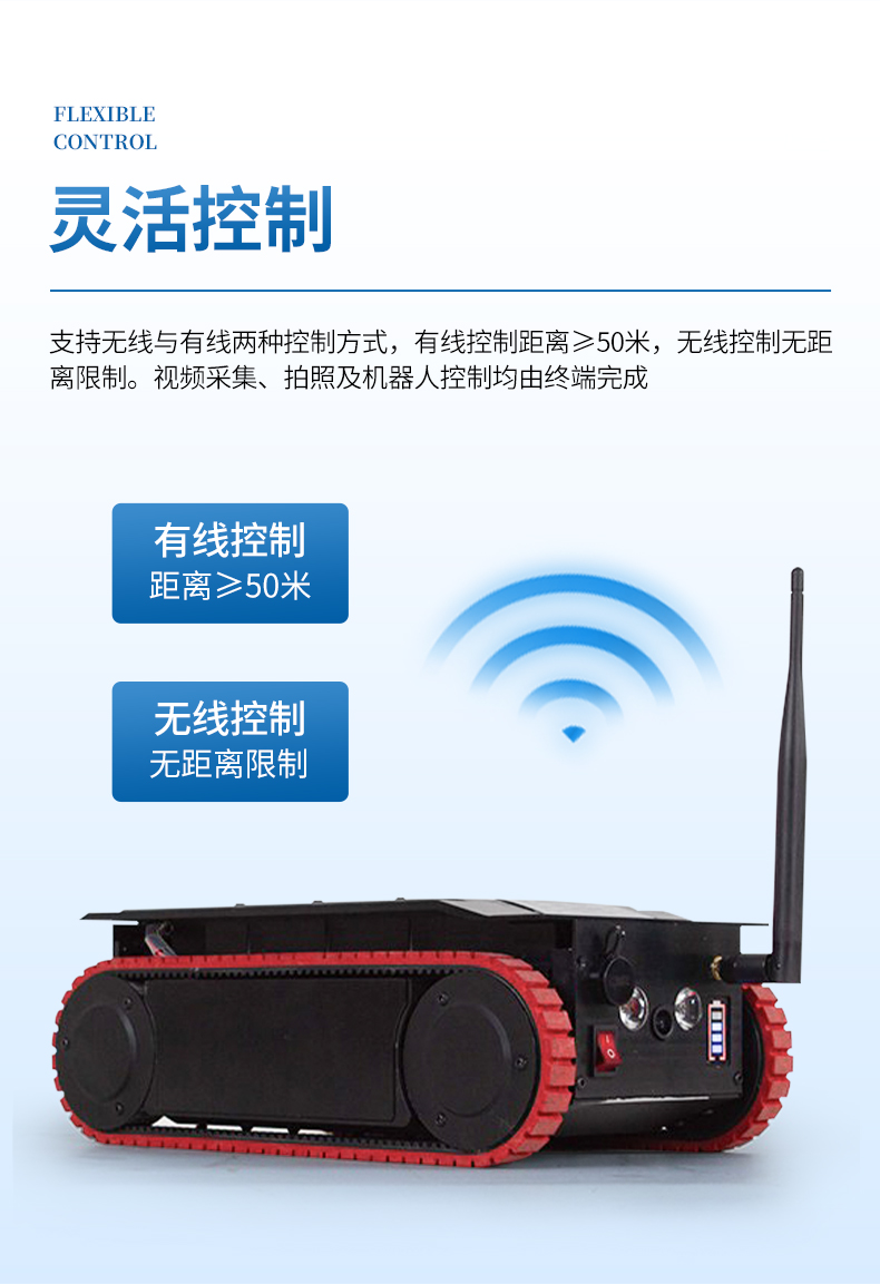 靈活控制:支持無線與有線兩種控制方式,有線控制距離≥50米,無線控制無距離限制。視頻采集、拍照及機(jī)器人控制均由終端完成。