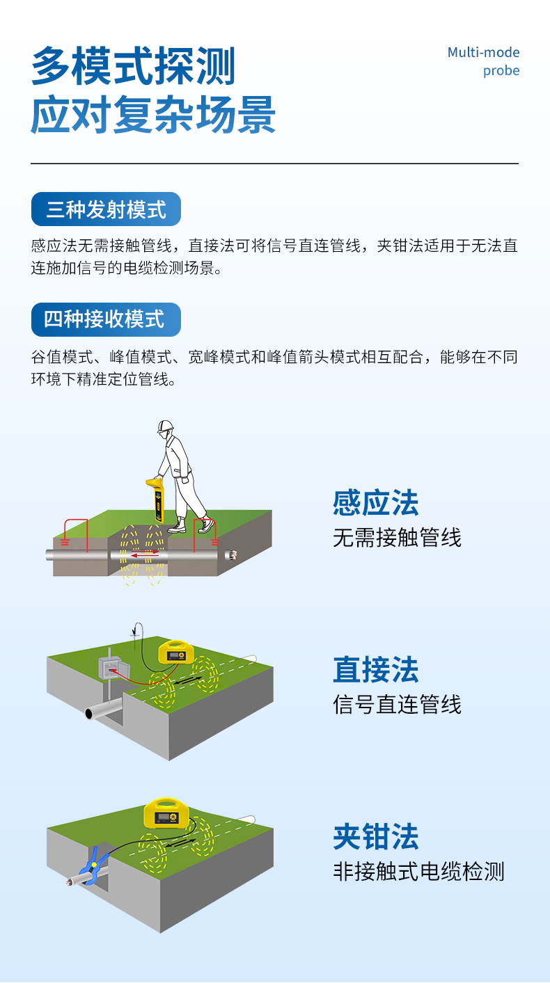 多種測(cè)量模式進(jìn)行管線定位(谷值模式、峰值模式、寬峰模式、峰值箭頭模式),可相互驗(yàn)證,確保管線定位的精確度。