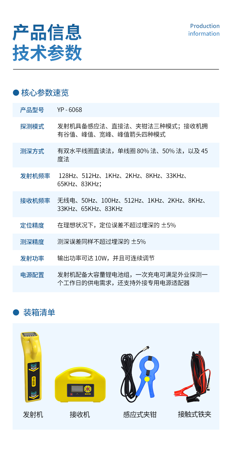 發(fā)射機(jī)頻率:128Hz、512Hz、1KHz、2KHz、8KHz、33KHz、65KHz、83KHz。