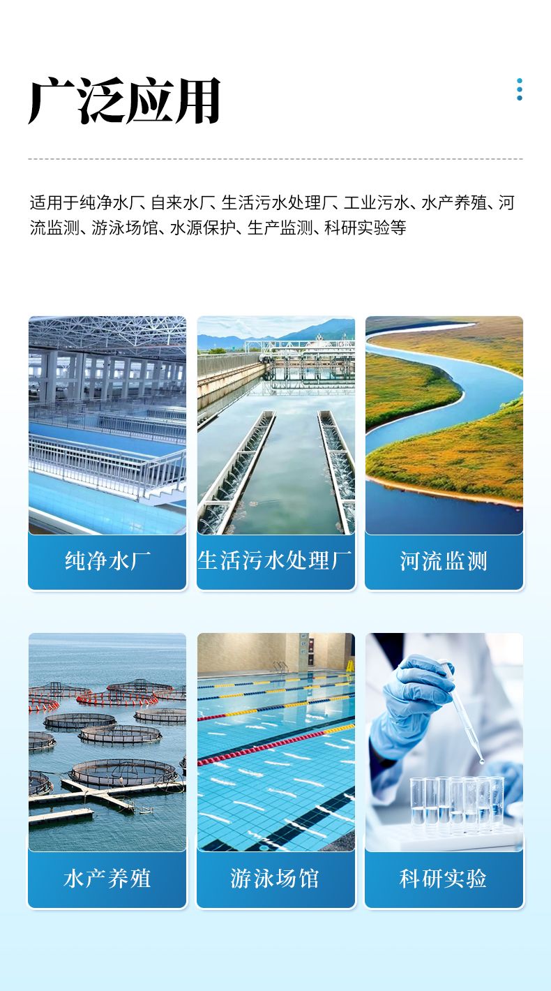 適用于純凈水廠、自來水廠、生活污水處理廠、工業(yè)污水、水產(chǎn)養(yǎng)殖、河流監(jiān)測、游泳場館、水源保護、生產(chǎn)監(jiān)測、科研實驗等。