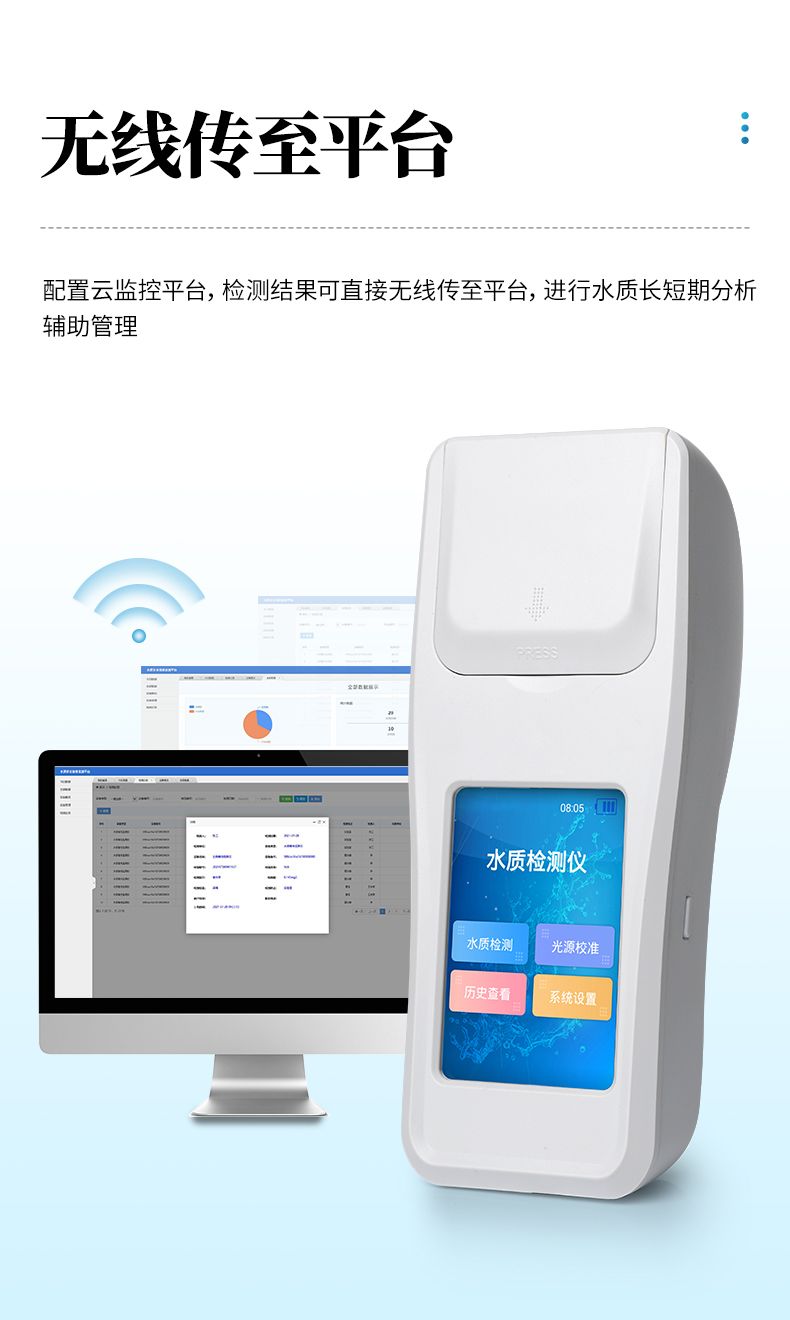 ②配置云監(jiān)控平臺,檢測結(jié)果可直接無線傳至平臺,進行水質(zhì)長短期分析,輔助管理。