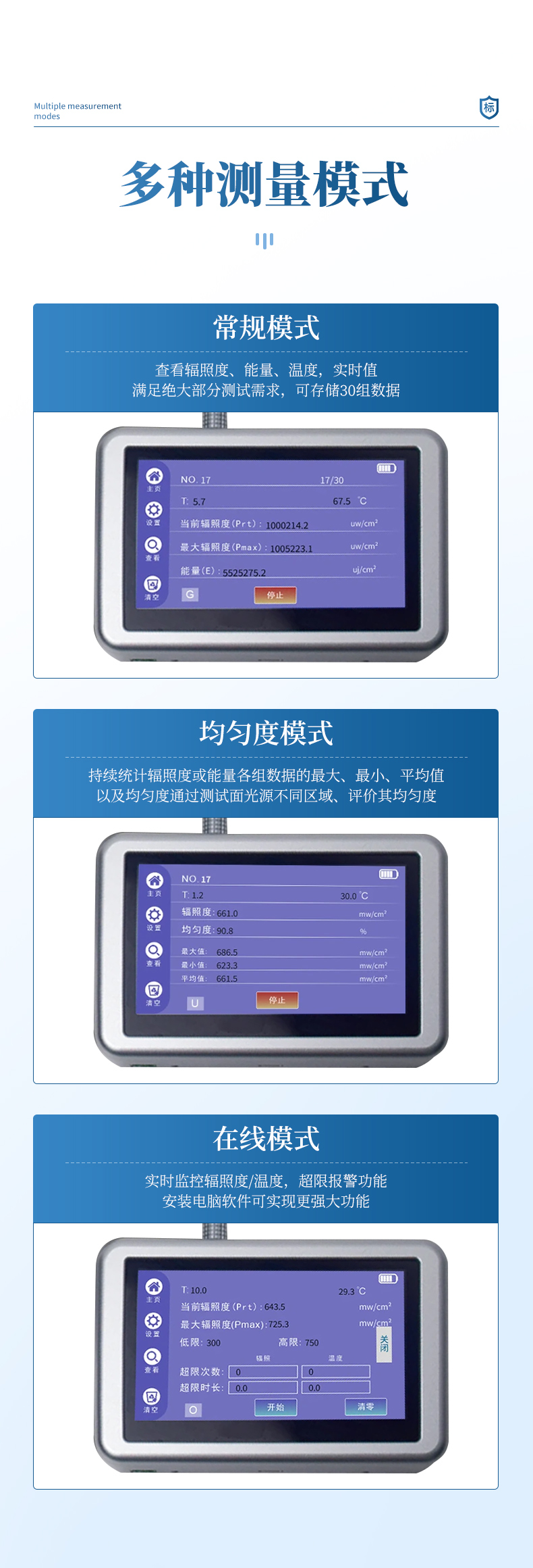 儀器分為主機(jī)和探頭兩部分,同一主機(jī)可根據(jù)不同使用需求搭配多款探頭,即插即用,滿足更多使用場(chǎng)景,可廣泛應(yīng)用于實(shí)驗(yàn)室、工廠或其他現(xiàn)場(chǎng)操作,幾乎可以在所有應(yīng)用領(lǐng)域的質(zhì)量控制中實(shí)現(xiàn)準(zhǔn)確的紫外線光強(qiáng)、能量測(cè)試。