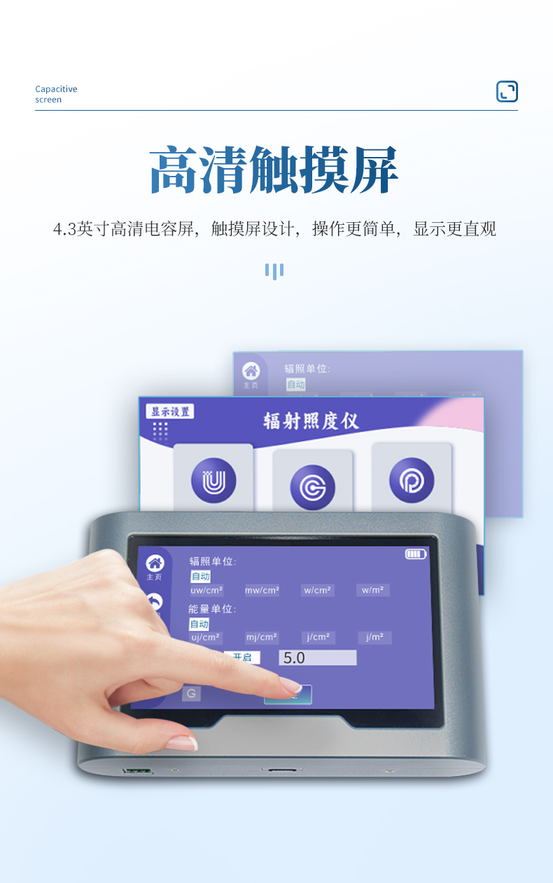 觸摸屏輻射照度計(jì)采用高清全觸摸屏設(shè)計(jì),操作更簡(jiǎn)單;即使是弱光也能快速讀