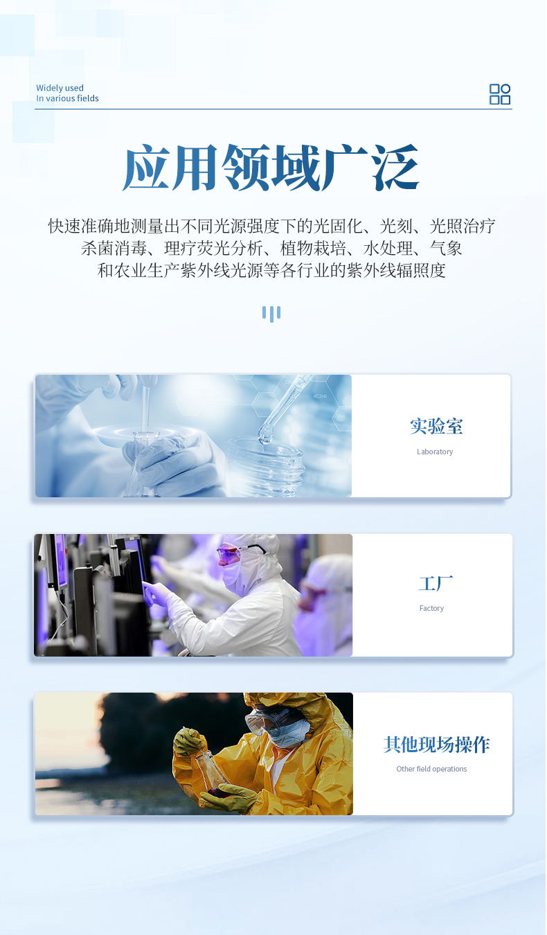 取,精度更高;量程可自動(dòng)識(shí)別切換,真正實(shí)現(xiàn)從弱光到強(qiáng)光一機(jī)式測(cè)試,儀器操作更加簡(jiǎn)單快捷。快速、準(zhǔn)確地測(cè)量出不同光源強(qiáng)度下的光固化、光刻、光照治療、殺菌消毒、理療熒光分析、植物栽培、水處理、氣象和農(nóng)業(yè)生產(chǎn)紫外線光源等各行業(yè)的紫外線輻照度。