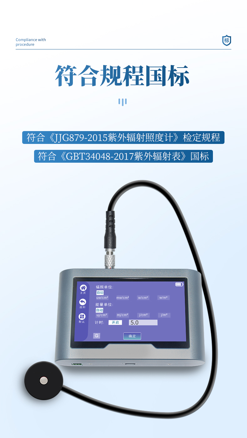 7.符合規(guī)程:《JJG879-2015紫外輻射照度計(jì)》檢定規(guī)程、《GBT34048-2017紫外輻射表》國(guó)標(biāo);