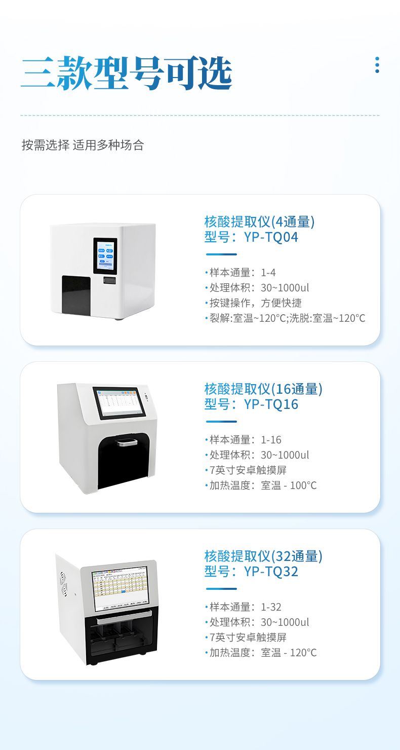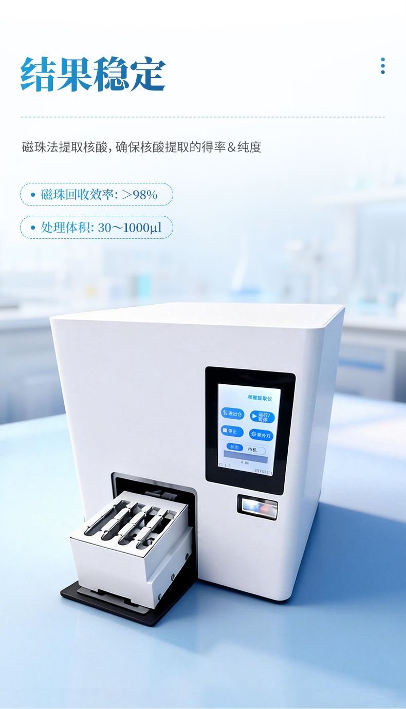 核酸提取儀通過磁珠法提取核酸,選擇相應(yīng)的試劑盒就可以自動的從多種樣品材料如血液、組織、細胞中分離純化高純度的核酸。具有兼容性強(適配預(yù)封裝提取試劑盒,也可適配單頭份試劑)、提取速度快、提取回收率高、操作簡便的優(yōu)點,是分子生物學(xué)實驗室檢測試驗的得力“助手”??蓮V泛應(yīng)用于科學(xué)研究、分子診斷、動植物疫病檢測等領(lǐng)域。