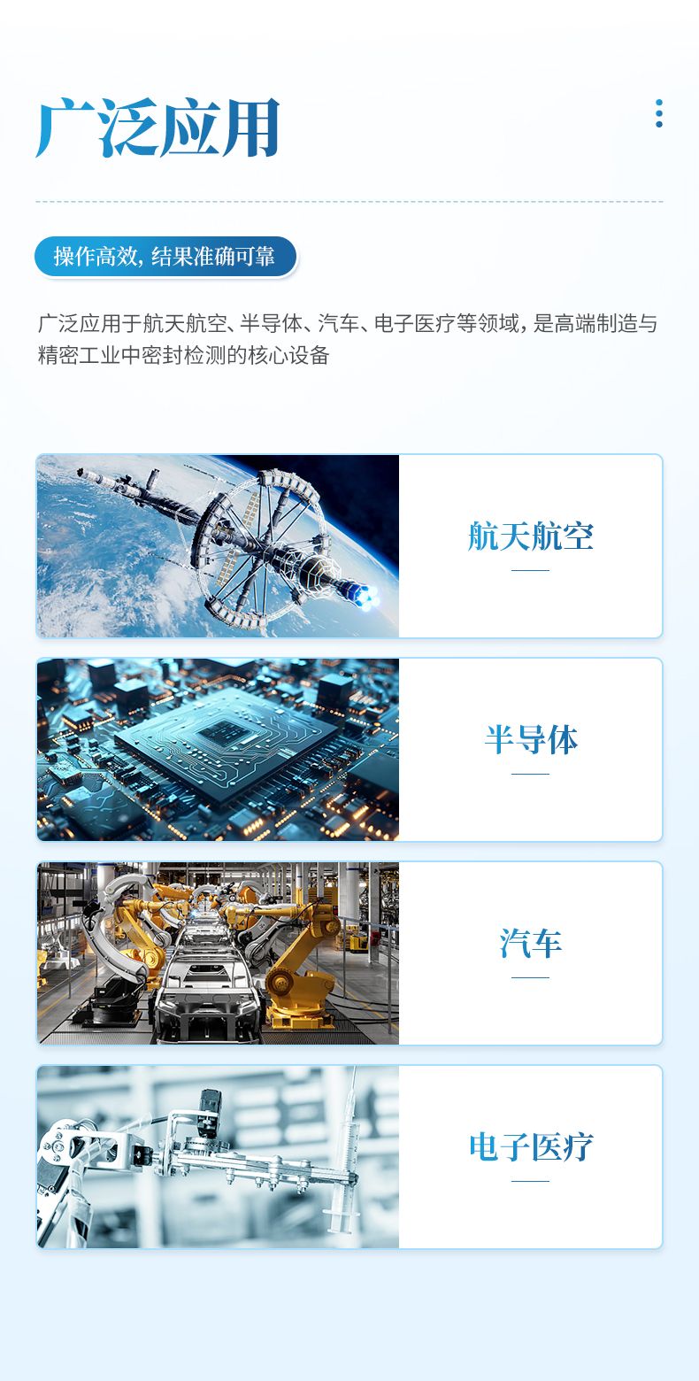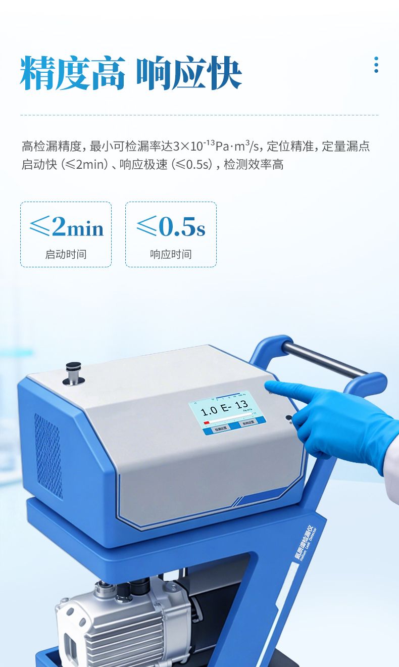 氦質(zhì)譜檢漏儀是采用質(zhì)譜學原理、以氦氣為示漏氣體的高精度無損檢漏設(shè)備,憑借氦氣大氣含量低、質(zhì)荷比特征鮮明的優(yōu)勢,實現(xiàn)超高靈敏度檢漏,可精準定位并定量漏點。設(shè)備支持真空噴氦、吸槍掃描、背壓累積等多種檢漏模式,適配真空 / 帶壓容器、密封組件、精密器件等不同檢測需求,廣泛應用于航天航空、半導體、汽車、電子醫(yī)療等領(lǐng)域,是高端制造與精密工業(yè)中密封檢測的核心設(shè)備。