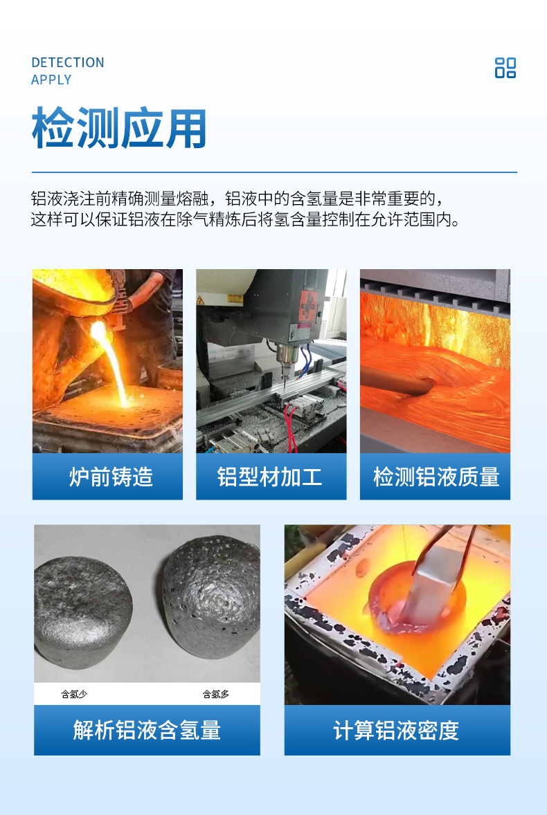 鋁液中唯一大量存在的氣體氫和各種夾渣的存在,使得鋁鑄件極易產(chǎn)生針孔、 顯微疏松等缺陷,導(dǎo)致力學(xué)性能、內(nèi)部質(zhì)量大為降低。因此在澆注前精確測量熔融鋁液中的含氫量是非常重要的,這樣可以保證鋁液在除氣精煉后將氫含量控制在允許范圍內(nèi)。