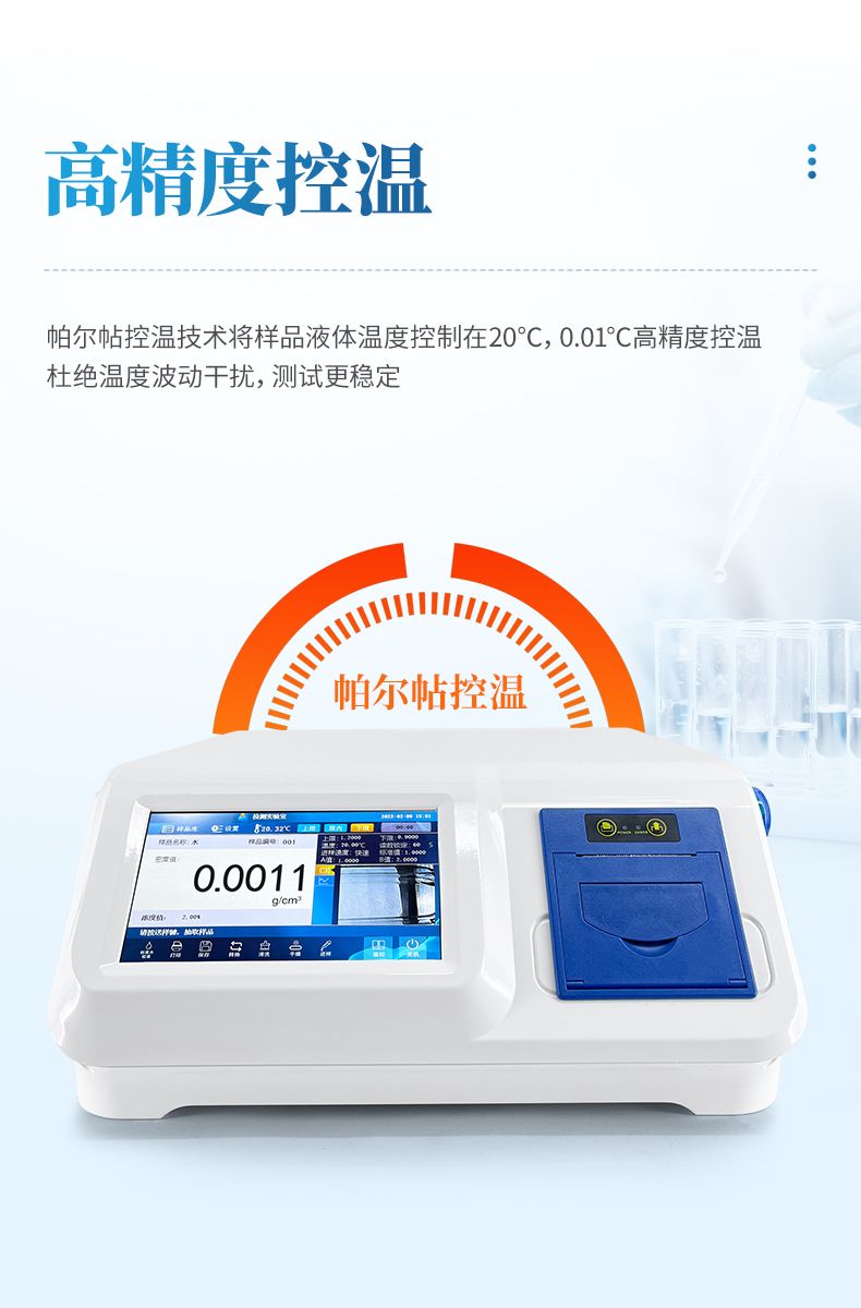 恒溫電子式液體密度計還能配合相應液體的密度濃度轉(zhuǎn)換軟件,直接讀出濃度值。并且有校準、采樣、恒溫控制、測試、清理、干燥、操作提示、觀察窗、密度曲線、樣品庫、數(shù)據(jù)儲存、數(shù)據(jù)統(tǒng)計、結(jié)果打印等功能,使用和保養(yǎng)更加方便。