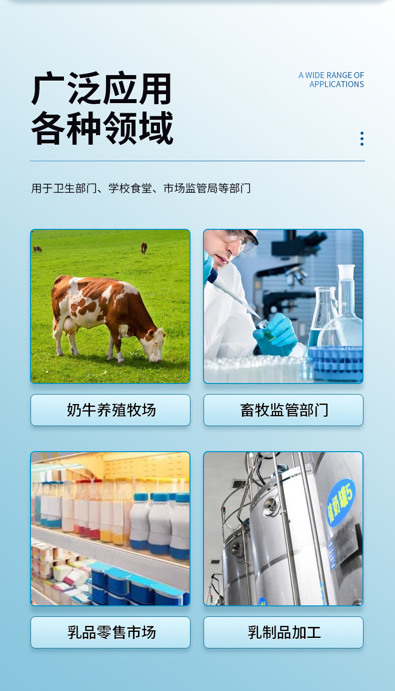 該儀器主要用于乳制品中脂肪,蛋白質(zhì)、乳糖、非脂固形物、密度、摻水率、冰點、灰份、溫度、PH值、電導(dǎo)率的測定,適用于牛奶、羊奶、UHT奶、駝奶等分析,是現(xiàn)代牧場、鮮奶收購站和中小型乳品企業(yè)監(jiān)控乳品質(zhì)量極為理想的儀器。