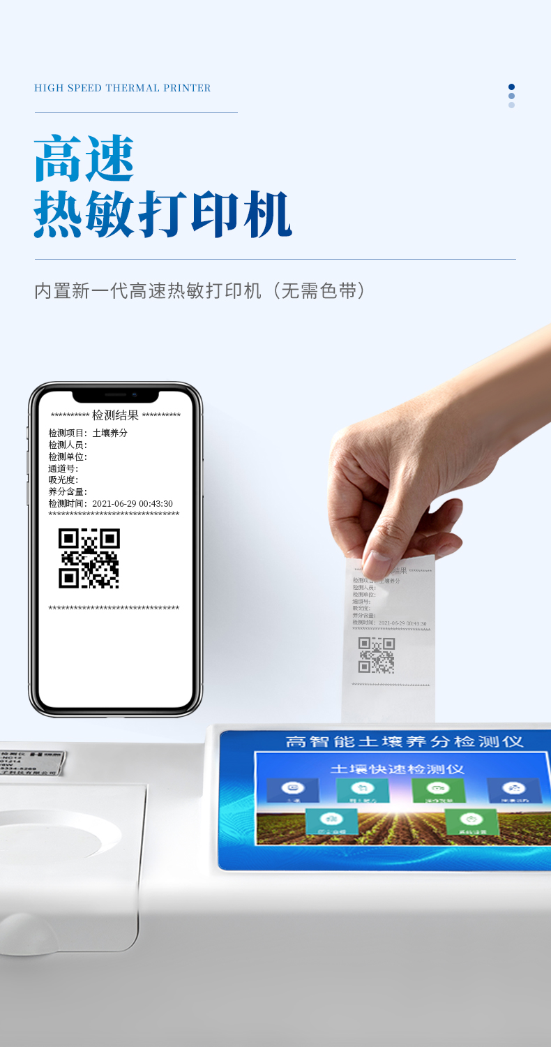 15、內(nèi)置新一代高速熱敏打印機(jī)(無需色帶),打印內(nèi)容包含:檢測單位、檢測人員、檢測項(xiàng)目、通道號、吸光度、養(yǎng)分含量(mg/kg)、檢測時(shí)間、以及二維碼等信息