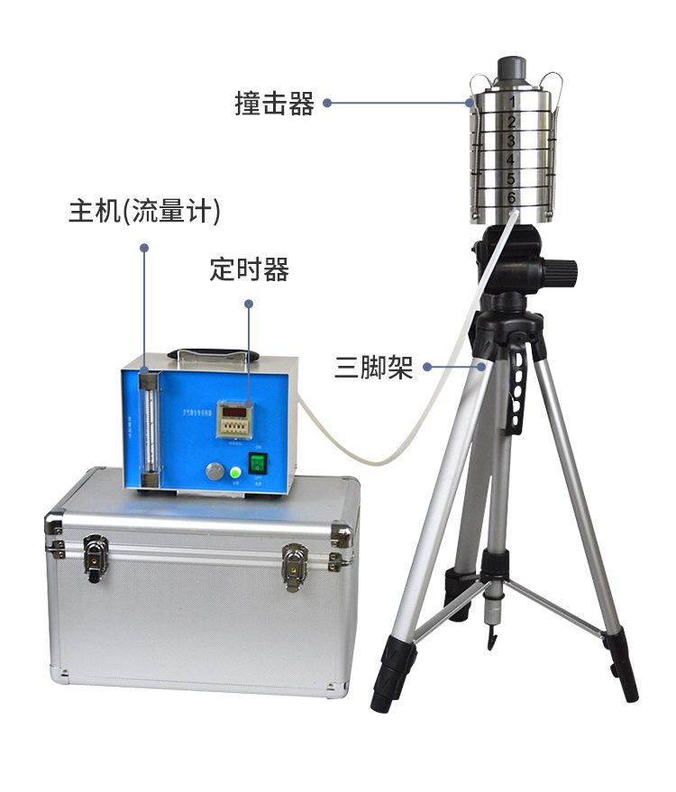 整個(gè)儀器是由撞擊器、主機(jī)(流量計(jì))、定時(shí)器、三腳架組成。撞擊器是6層有微小孔眼的鋁合金圓盤(pán)。圓盤(pán)下放瓊脂平皿,每圓盤(pán)間有密封膠圈,在通過(guò)三個(gè)彈簧掛 鉤把圓盤(pán)牢固地聯(lián)在一起。每個(gè)圓盤(pán)上有400個(gè)成環(huán)行排列、逐層減小、尺寸精確的小孔,標(biāo)準(zhǔn)采樣流量為1立方呎(28.3L/min)。當(dāng)含有微生物粒子 的氣流進(jìn)入最上層的采樣口后,由于氣流的逐層增高,不同大小的微生物粒子按空氣動(dòng)力學(xué)特征分別撞擊在相應(yīng)的瓊脂表面上。捕獲在各級(jí)上的粒子大小范圍是由該 級(jí)孔眼的氣流速度和上一級(jí)的粒子截阻率而決定的。第1、2級(jí)類(lèi)似人的上呼吸道捕獲的粒子,第3~6級(jí)類(lèi)似人的下呼吸道捕獲的粒子,這就相當(dāng)程度上復(fù)制了這 些粒子在呼吸道的穿透作用和沉著部位。