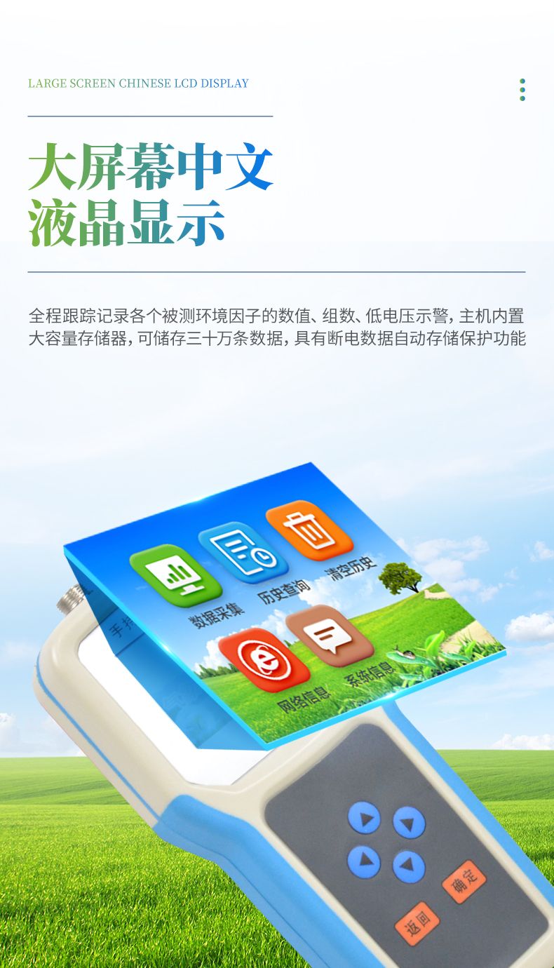 手持式智能農(nóng)業(yè)氣象環(huán)境檢測儀是我們專門針對農(nóng)田、草場局部小尺度環(huán)境設(shè)計(jì)的,對與植被和農(nóng)作物生長密切相關(guān)的土壤、水氣等環(huán)境參數(shù)監(jiān)測的農(nóng)田小氣候站。它主要觀測與農(nóng)業(yè)相關(guān)的空氣溫度、空氣濕度、光照強(qiáng)度、二氧化碳濃度、露點(diǎn)溫度、光合有效輻射、土壤溫度、土壤濕度、土壤鹽分、土壤PH等10個環(huán)境參數(shù)氣象要素,為農(nóng)業(yè)科研、農(nóng)業(yè)生產(chǎn)等提供良好的支持。