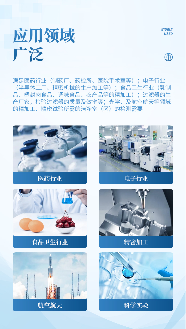 滿足醫(yī)藥行業(yè)(制藥廠、藥檢所、醫(yī)院手術(shù)室等);電子行業(yè)(半導(dǎo)體工廠、精密機械的生產(chǎn)加工等);食品衛(wèi)生行業(yè)(乳制品、塑封肉食品、調(diào)味食品、農(nóng)產(chǎn)品等的精加工);過濾器的生產(chǎn)廠家,檢驗過濾器的質(zhì)量及效率等;光學(xué)、及航空航天等領(lǐng)域的精加工、精密試驗所需的潔凈室(區(qū))的檢測需要。