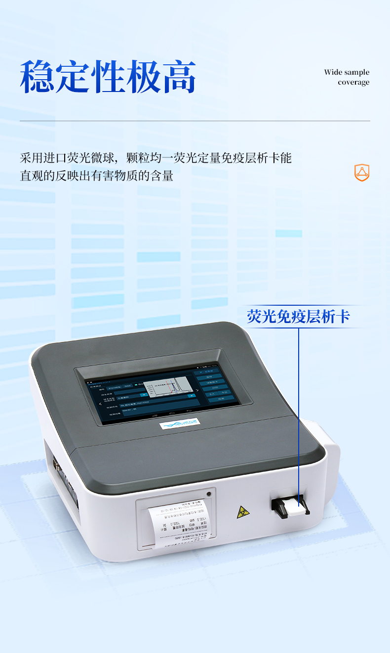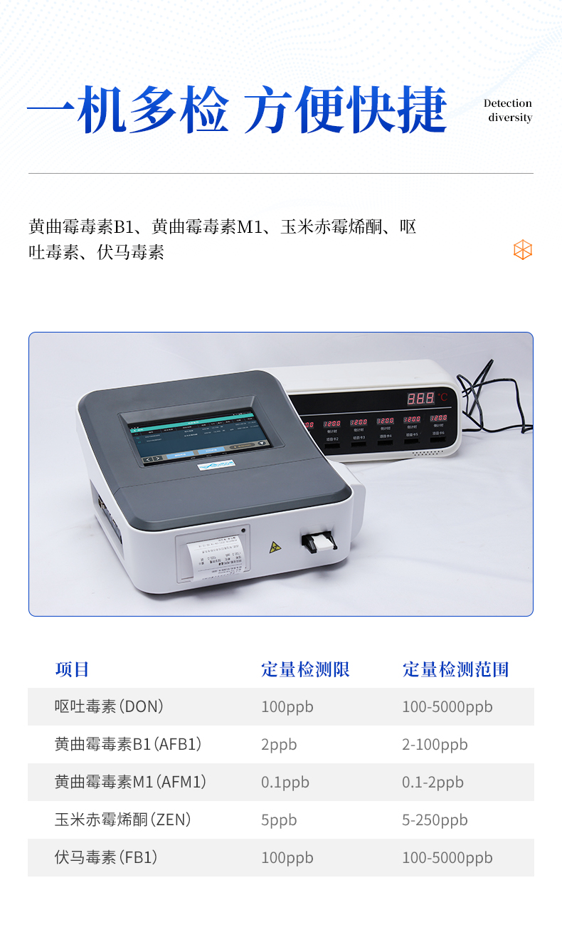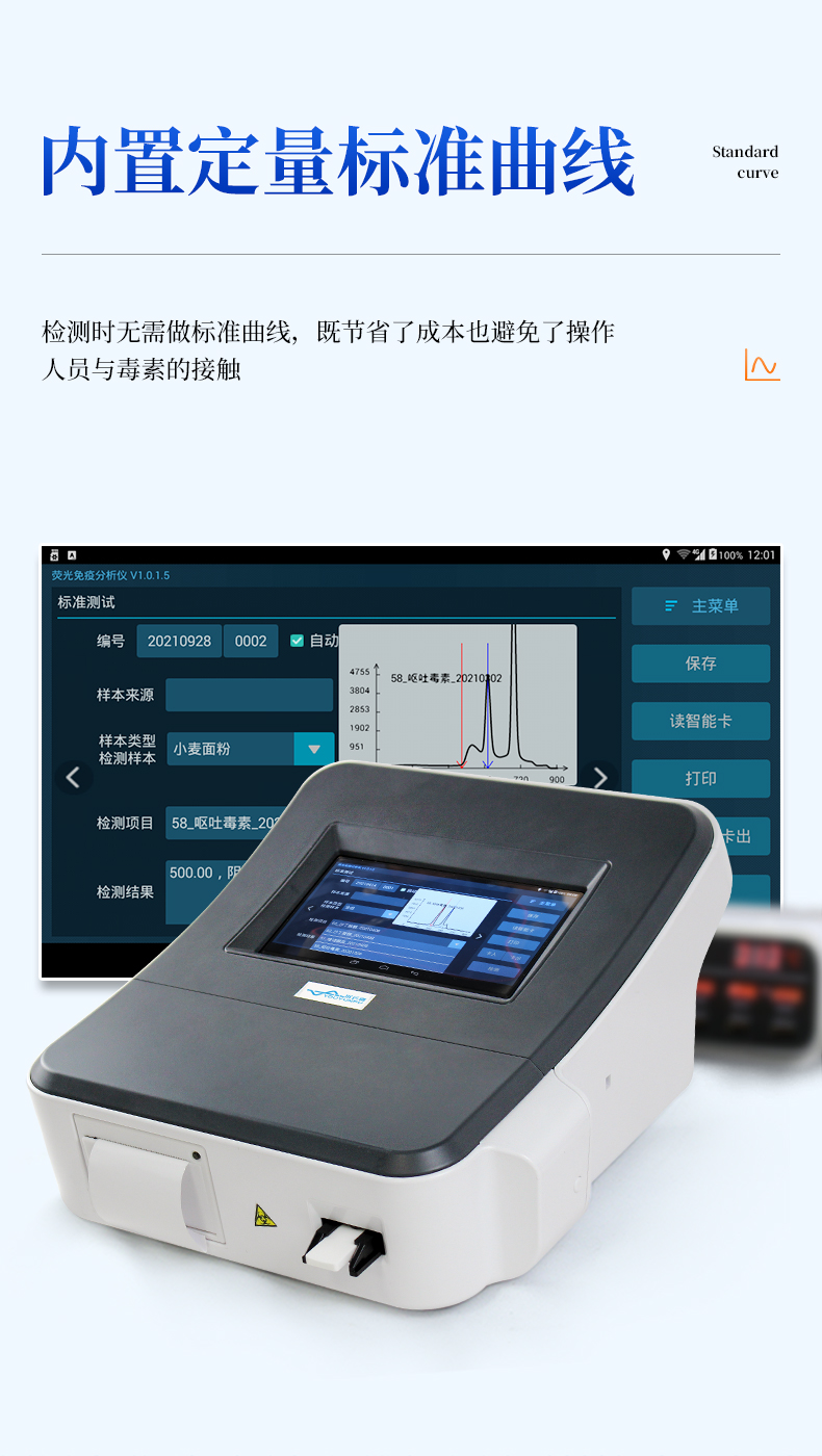 3、內(nèi)置定量標(biāo)準(zhǔn)曲線:儀器內(nèi)置標(biāo)準(zhǔn)曲線,無(wú)需使用標(biāo)準(zhǔn)品,檢測(cè)時(shí)無(wú)需做標(biāo)準(zhǔn)曲線,既節(jié)省了成本,也避免了操作人員與嘔吐毒素的接觸,保護(hù)操作人員的安全;