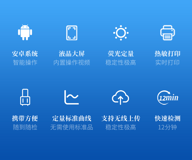 11、檢測(cè)判讀:儀器具有開(kāi)機(jī)自檢功能,12S內(nèi)完成檢測(cè)卡判讀,單個(gè)樣本的檢測(cè)時(shí)間小于8S。