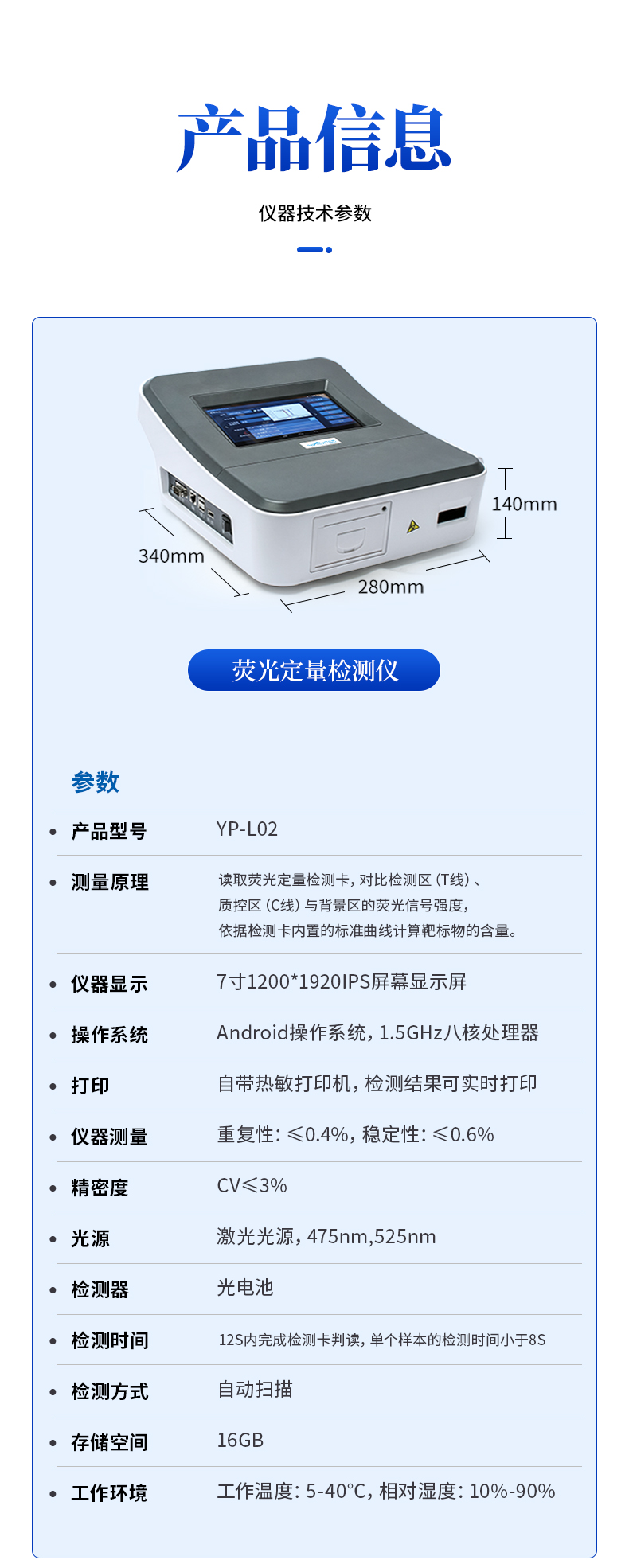 1、測(cè)量原理:讀取熒光定量檢測(cè)卡,對(duì)比檢測(cè)區(qū)(T線)、質(zhì)控區(qū)(C線)與背景區(qū)的熒光信號(hào)強(qiáng)度,依據(jù)檢測(cè)卡內(nèi)置的標(biāo)準(zhǔn)曲線計(jì)算靶標(biāo)物的含量。