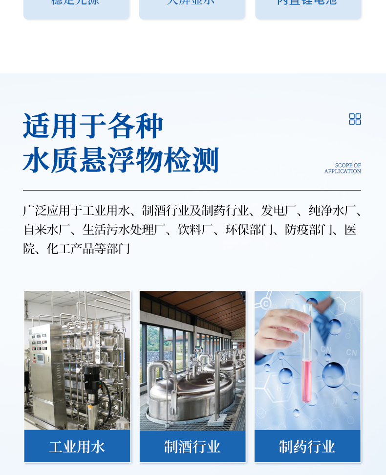可以廣泛應(yīng)用于發(fā)電廠、純凈水廠、自來水廠、生活污水處理廠、飲料廠、環(huán)保部門、工業(yè)用水、制酒行業(yè)及制藥行業(yè)、防疫部門、醫(yī)院、化工產(chǎn)品等部門的濁度測(cè)量.