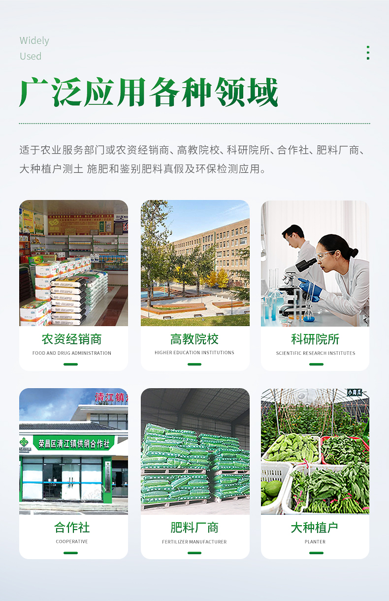 配套齊全:該儀器集藥、器、儀為一體,攜帶方便,相當(dāng)于一個(gè)小型移動(dòng)實(shí)驗(yàn)室,無(wú)需用戶自配附件,亦可靈活野外流動(dòng)測(cè)試。適于農(nóng)業(yè)服務(wù)部門(mén)或農(nóng)資經(jīng)銷商、高教院校、科研院所、合作社、肥料廠商、大種植戶測(cè)土施肥和鑒別肥料真假及環(huán)保檢測(cè)應(yīng)用。