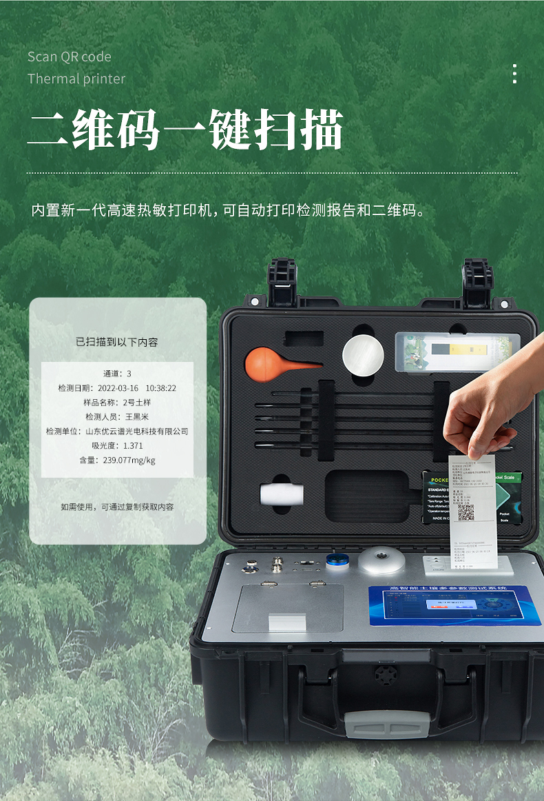 21、內(nèi)置新一代高速熱敏打印機(jī)(無(wú)需色帶),打印內(nèi)容包含:檢測(cè)單位、檢測(cè)人員、檢測(cè)項(xiàng)目、通道號(hào)、吸光度、養(yǎng)分含量(mg/kg)、檢測(cè)時(shí)間、以及二維碼等信息