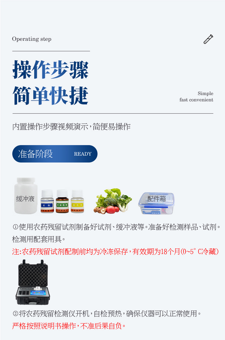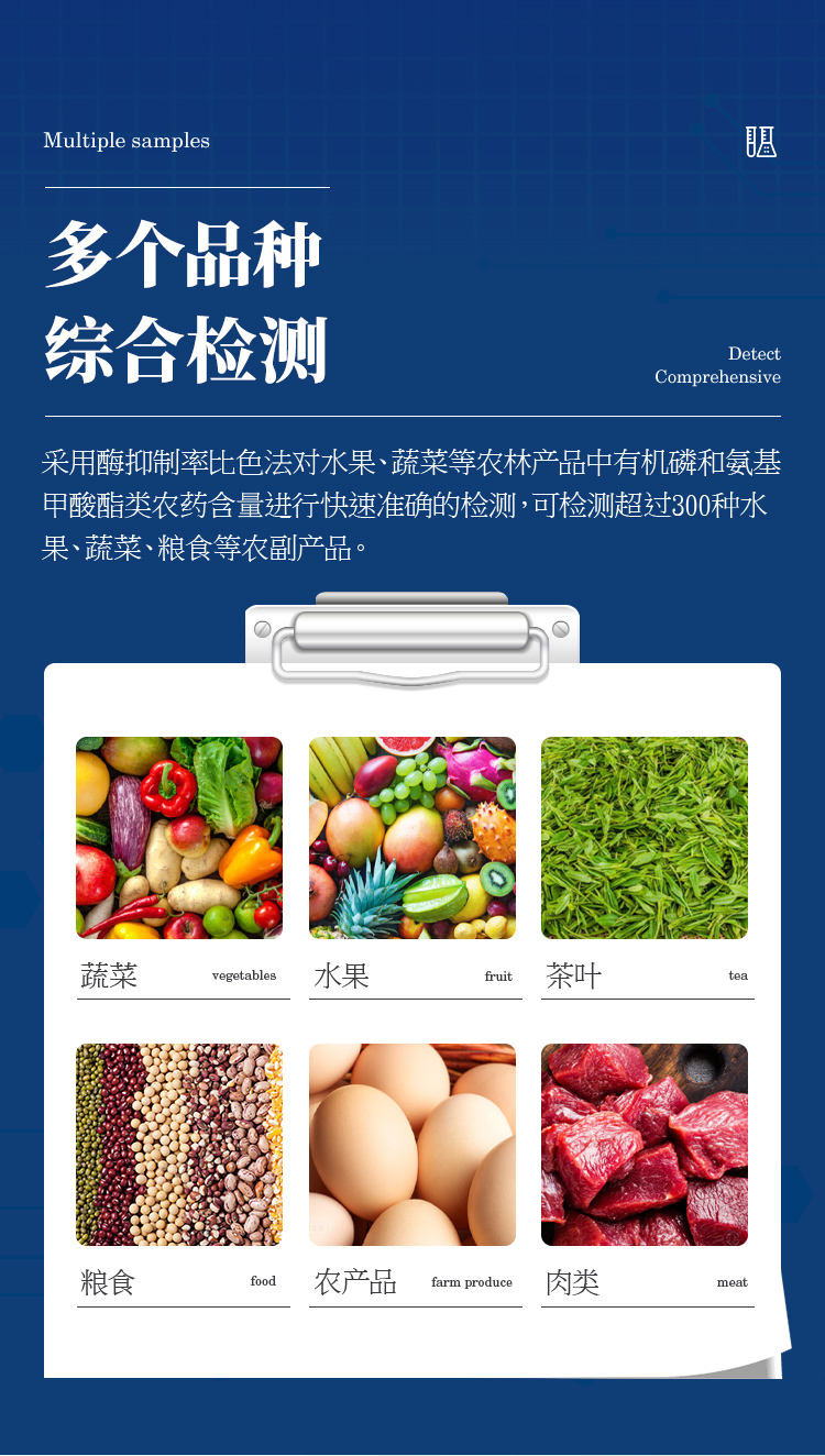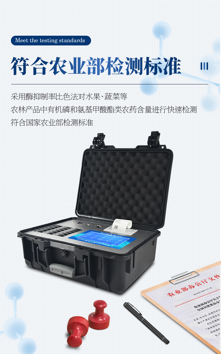 檢測標(biāo)準(zhǔn):依據(jù)國家標(biāo)準(zhǔn)方法(GB/T5009.199-2003)以及世界衛(wèi)生組織WHO、世界糧農(nóng)組織FAO殘留農(nóng)藥檢測標(biāo)準(zhǔn)、世界環(huán)境保護(hù)局EPA參照攝入量等要求來設(shè)計。采用酶抑制率比色法對水果、蔬菜等農(nóng)林產(chǎn)品中有機(jī)磷和氨基甲酸酯類農(nóng)藥含量進(jìn)行快速準(zhǔn)確的檢測,乙酰膽堿酯酶和丁酰膽堿酯酶試劑均可以使用,符合國家標(biāo)準(zhǔn)和農(nóng)業(yè)部標(biāo)準(zhǔn)的要求。