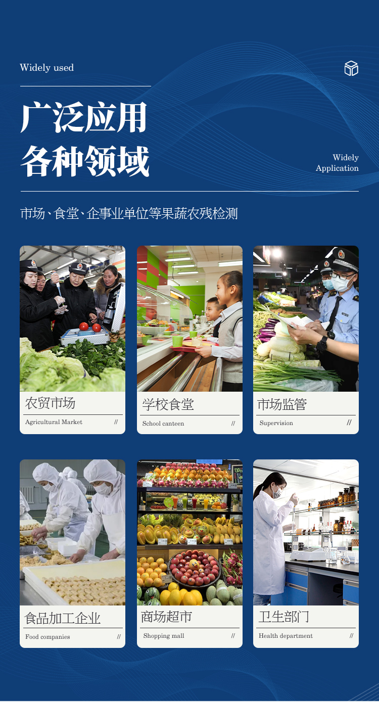 廣泛應(yīng)用于主要用于蔬菜、水果、茶葉、糧食、農(nóng)副產(chǎn)品等食品中有機(jī)磷和氨基甲酸酯類農(nóng)藥殘留的快速檢測;此外還可用于果蔬茶生產(chǎn)基地和農(nóng)貿(mào)批發(fā)銷售市場現(xiàn)場檢測,餐館、學(xué)校、食堂、家庭果蔬加工前的安全速測等。