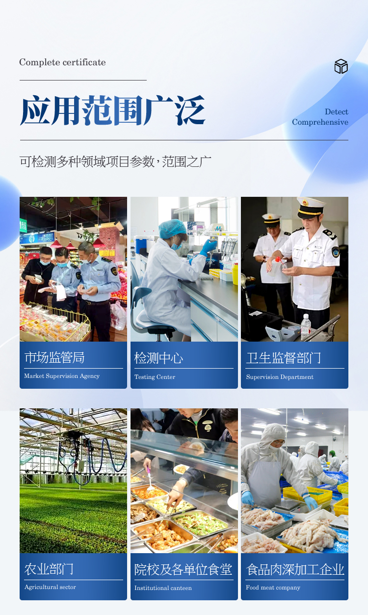 該多功能食品安全檢測儀為集成化食品安全快速檢測分析設(shè)備,廣泛應(yīng)用于食藥監(jiān)局、衛(wèi)生部門、高教院校、科研院所、農(nóng)業(yè)部門、養(yǎng)殖場、屠宰場、食品肉產(chǎn)品深加工企業(yè)、檢驗檢疫部門等單位使用。