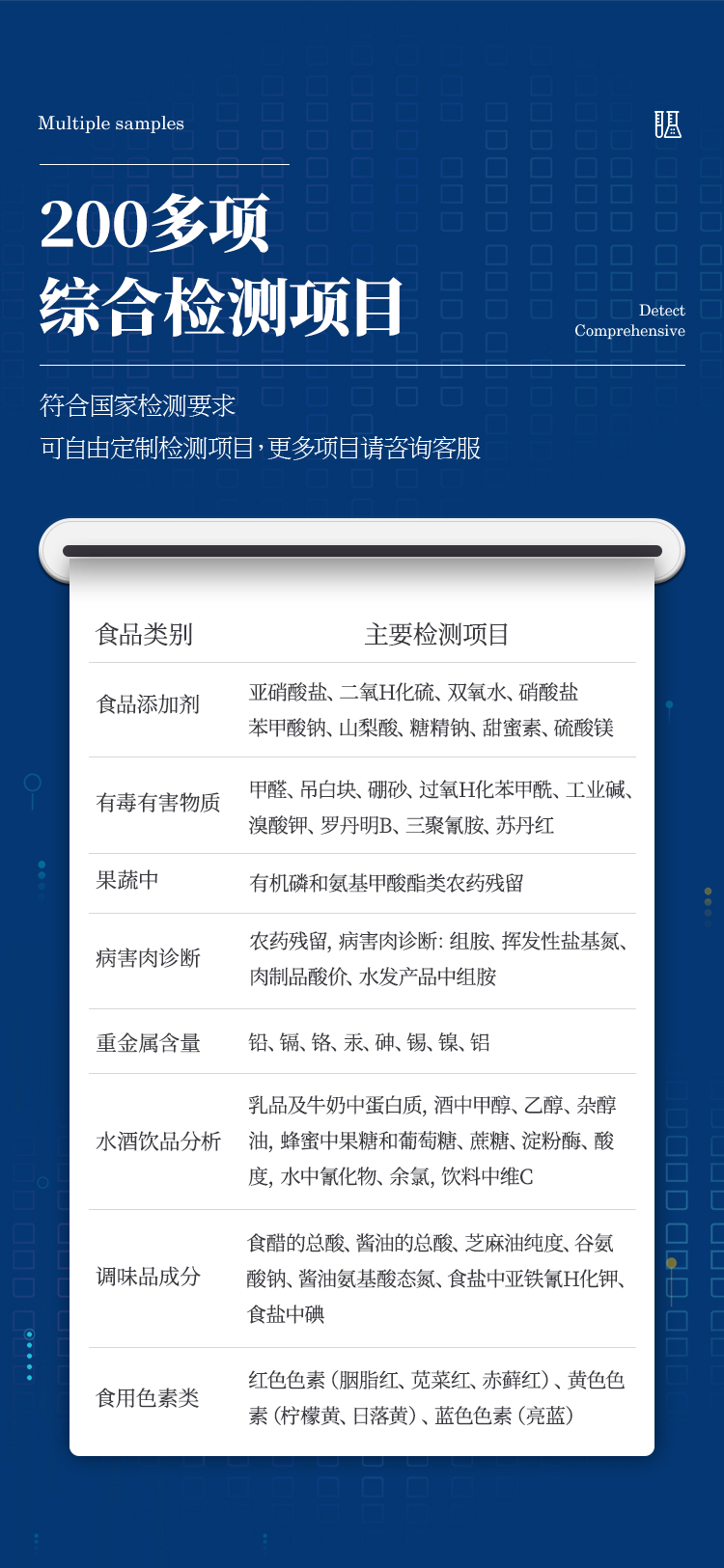 可快速檢測(cè)各類食品中的亞硝酸鹽、二氧化硫、甲醛、吊白塊、雙氧水、硼砂、農(nóng)藥殘留、乳及乳制品中蛋白質(zhì)、硝酸鹽、重金屬鉛的含量,儀器預(yù)留其他項(xiàng)目檢測(cè)程序和端口,根據(jù)日后需求可方便的自主增加檢測(cè)項(xiàng)目。