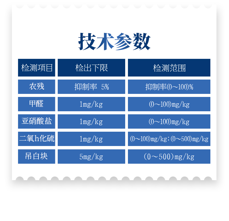 1、農(nóng) 殘: 檢出下限:抑制率 5% ,檢測(cè)范圍:抑制率(0~100)%