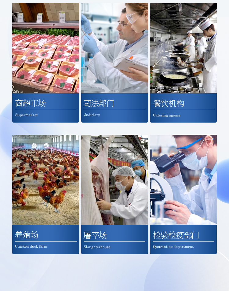 該多功能食品安全檢測儀為集成化食品安全快速檢測分析設備,廣泛應用于食藥監(jiān)局、衛(wèi)生部門、高教院校、科研院所、農(nóng)業(yè)部門、養(yǎng)殖場、屠宰場、食品肉產(chǎn)品深加工企業(yè)、檢驗檢疫部門等單位使用。