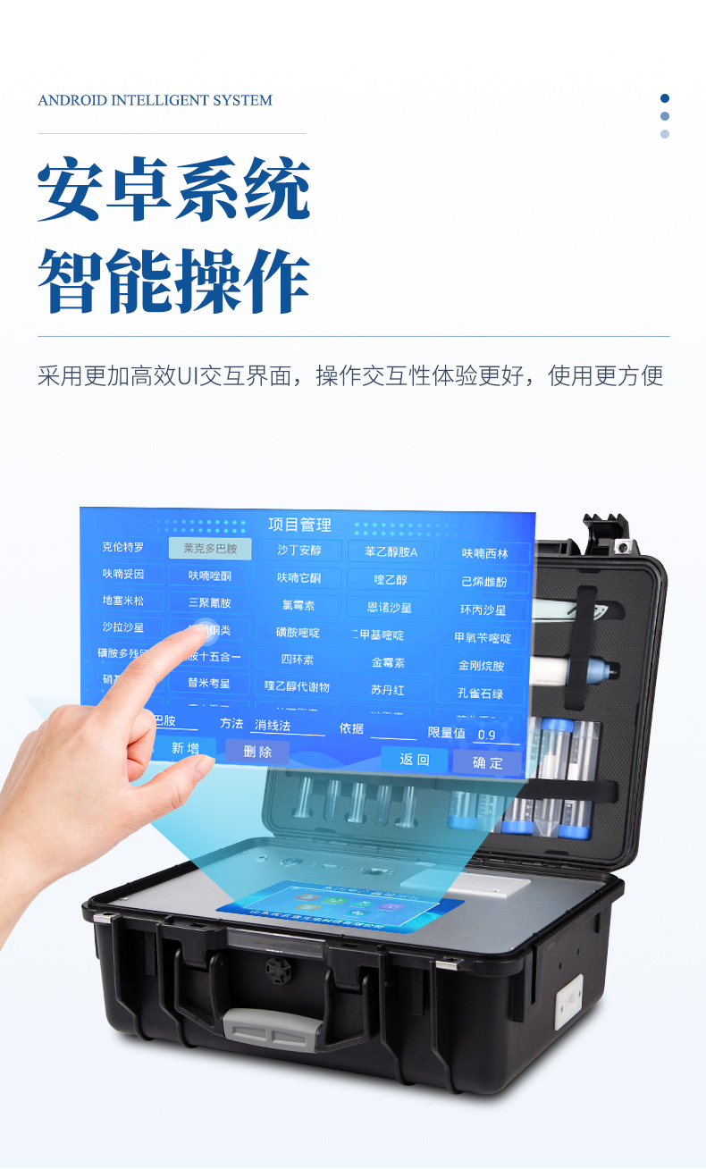 6、一體化便攜式快檢設(shè)備,滿足現(xiàn)場及流動檢測使用需求,能夠在同一軟件下實現(xiàn)所有檢測項目的檢測,并可通過同一窗口直觀顯示檢測結(jié)果。