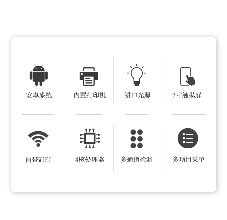 3、四波長冷光源,每個(gè)通道均配置410、520、590、630nm波長光源,標(biāo)配先進(jìn)的光路切換裝置,專利光路切換功能可實(shí)現(xiàn)最多64波長,并且所有檢測項(xiàng)目可實(shí)現(xiàn)所有通道同時(shí)檢測。