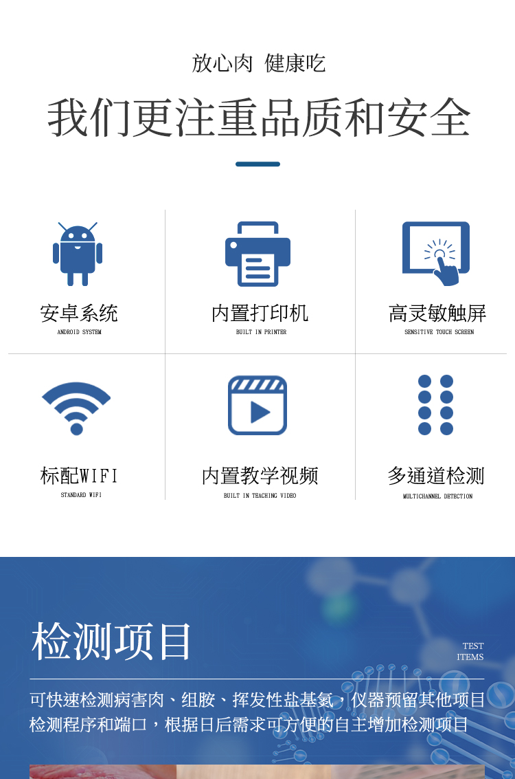 可快速檢測病害肉、組胺、揮發(fā)性鹽基氮,儀器預(yù)留其他項(xiàng)目檢測程序和端口,根據(jù)日后需求可方便的自主增加檢測項(xiàng)目。