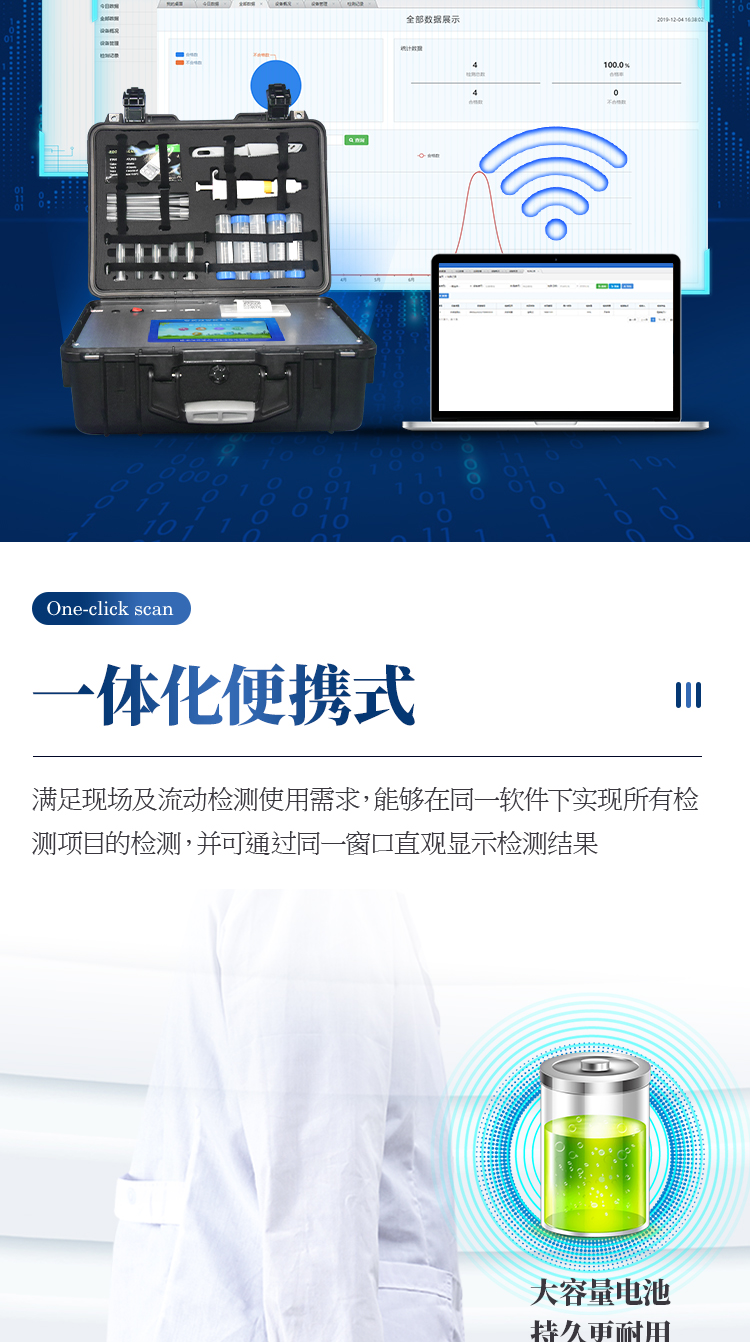 7、一體化便攜式快檢設備,滿足現(xiàn)場及流動檢測使用需求,能夠在同一軟件下實現(xiàn)所有檢測項目的檢測,并可通過同一窗口直觀顯示檢測結果。