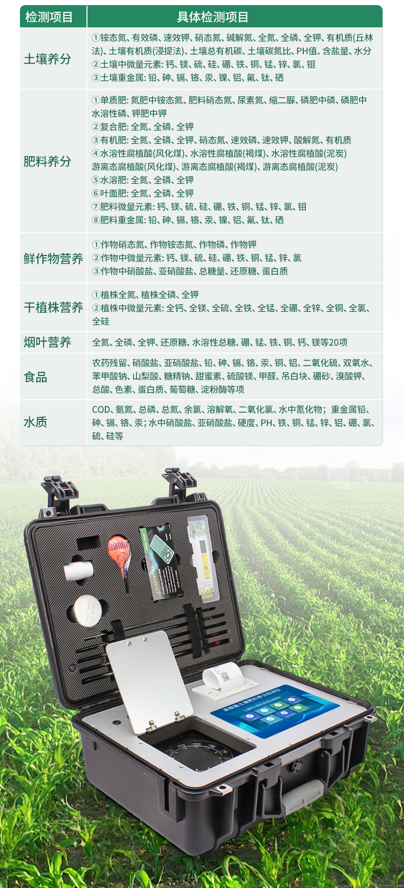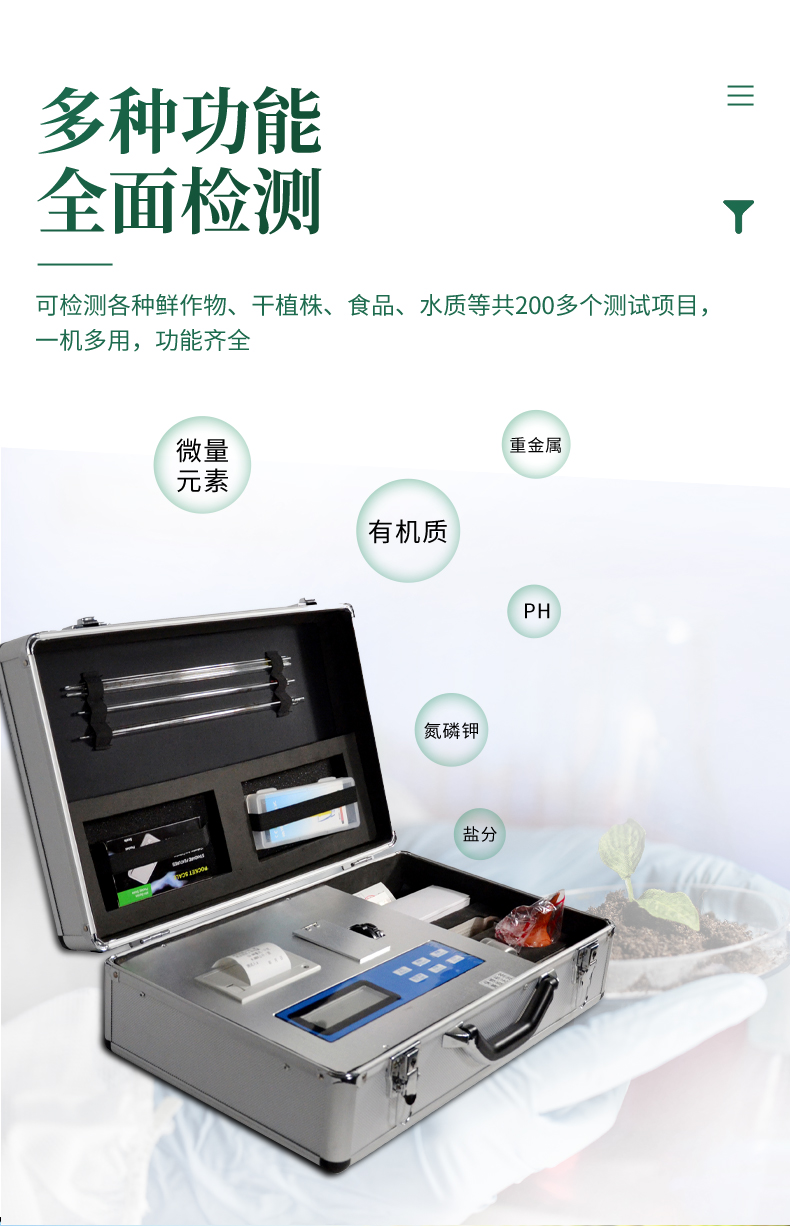 【產品簡介】可檢測土壤及化肥、有機肥、植株中的氮磷鉀、有機質含量,土壤酸堿度,含鹽量。
