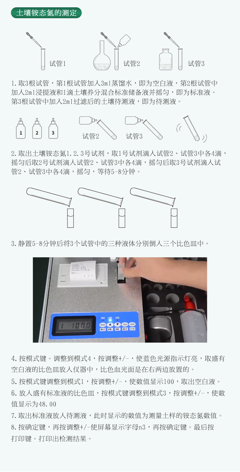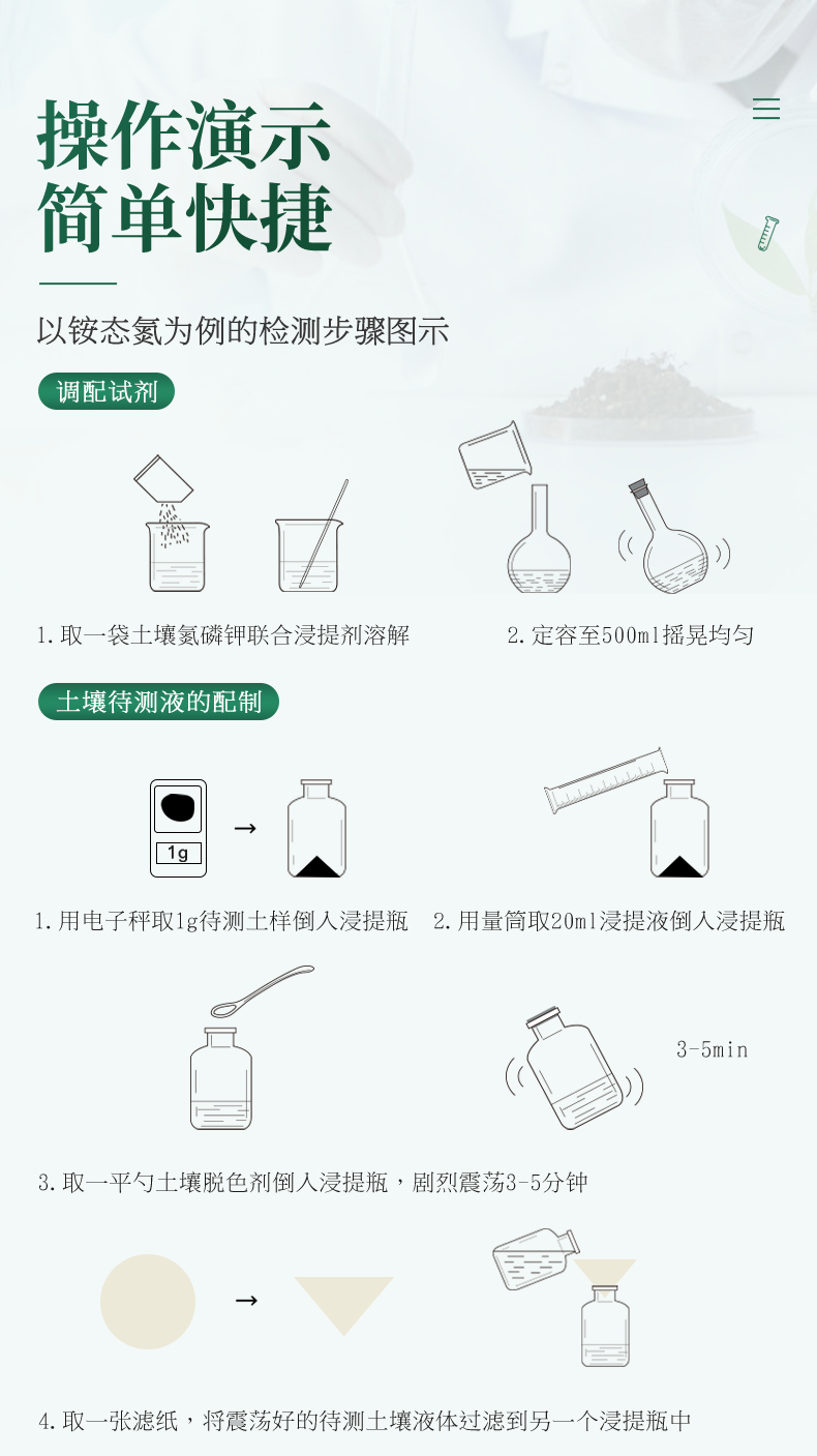 土壤養(yǎng)分:● 銨態(tài)氮、速效磷、速效鉀、水份、有機質、酸堿度(pH試紙法)等項;