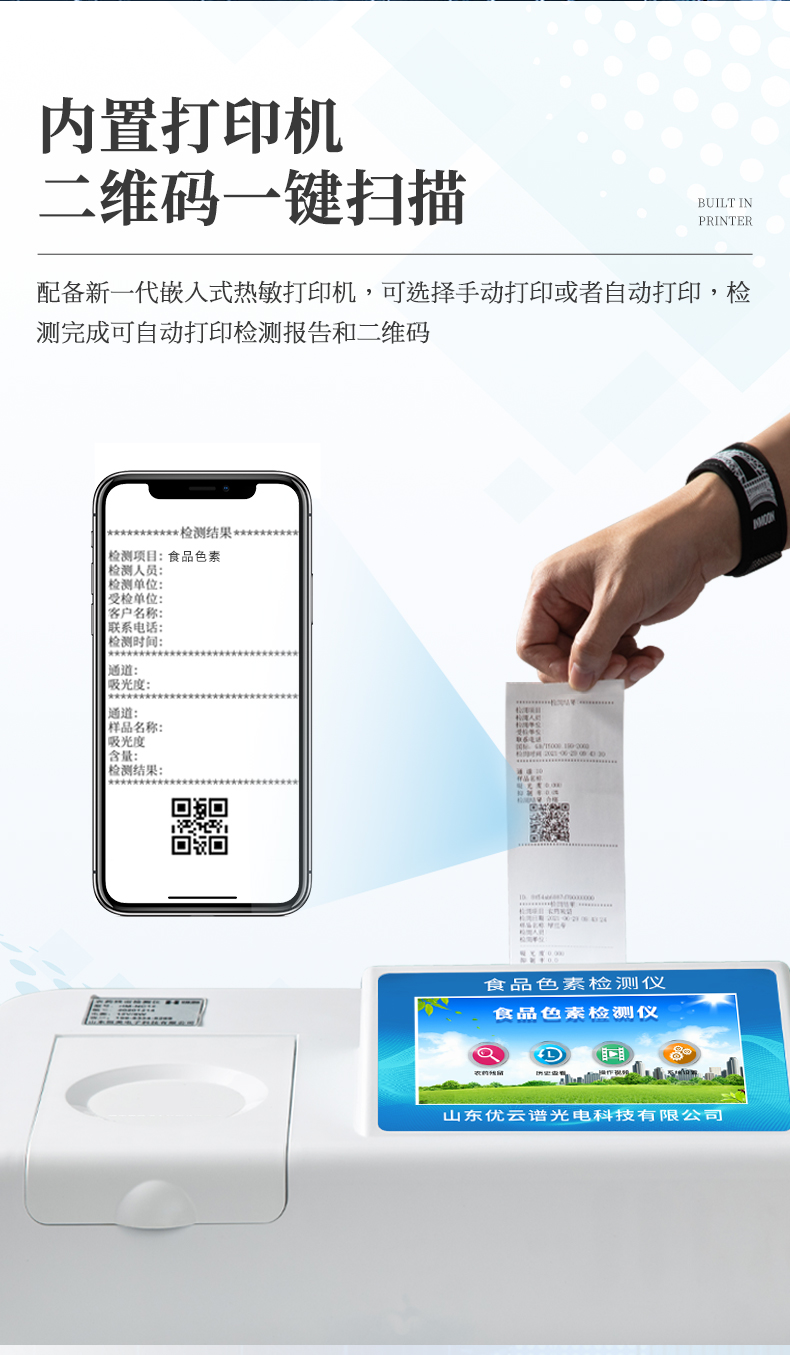 3、配備新一代嵌入式熱敏打印機,可選擇手動打印或者自動打印,檢測完成可自動打印檢測報告和二維碼。