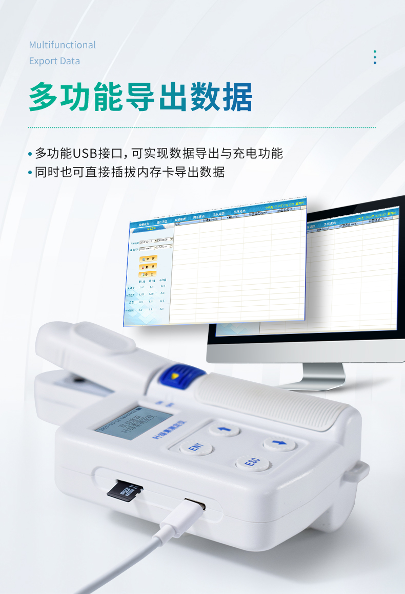 5.多功能USB接口,可實現(xiàn)數(shù)據(jù)導出與充電功能,可將儀器與電腦直接聯(lián)機,數(shù)據(jù)導出無需上位機軟件,還可選擇使用內(nèi)存卡直接導出數(shù)據(jù),操作簡單方便