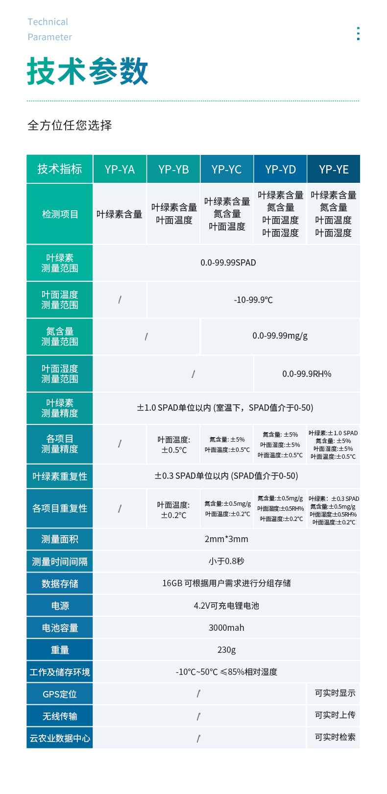 氮含量:±0.5mg/g 葉面濕度:±0.5RH% 葉面溫度:±0.2℃