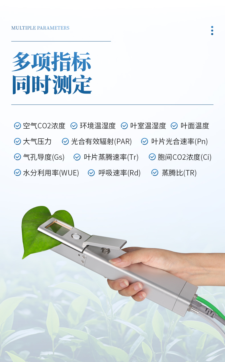 ?多功能:同時測定光合速率、蒸騰速率、胞間二氧化碳濃度、氣孔導(dǎo)度和水分利用效率,以及二氧化碳濃度、相對濕度、光合有效輻射和空氣溫度、葉片溫度、大氣壓力等指標(biāo);