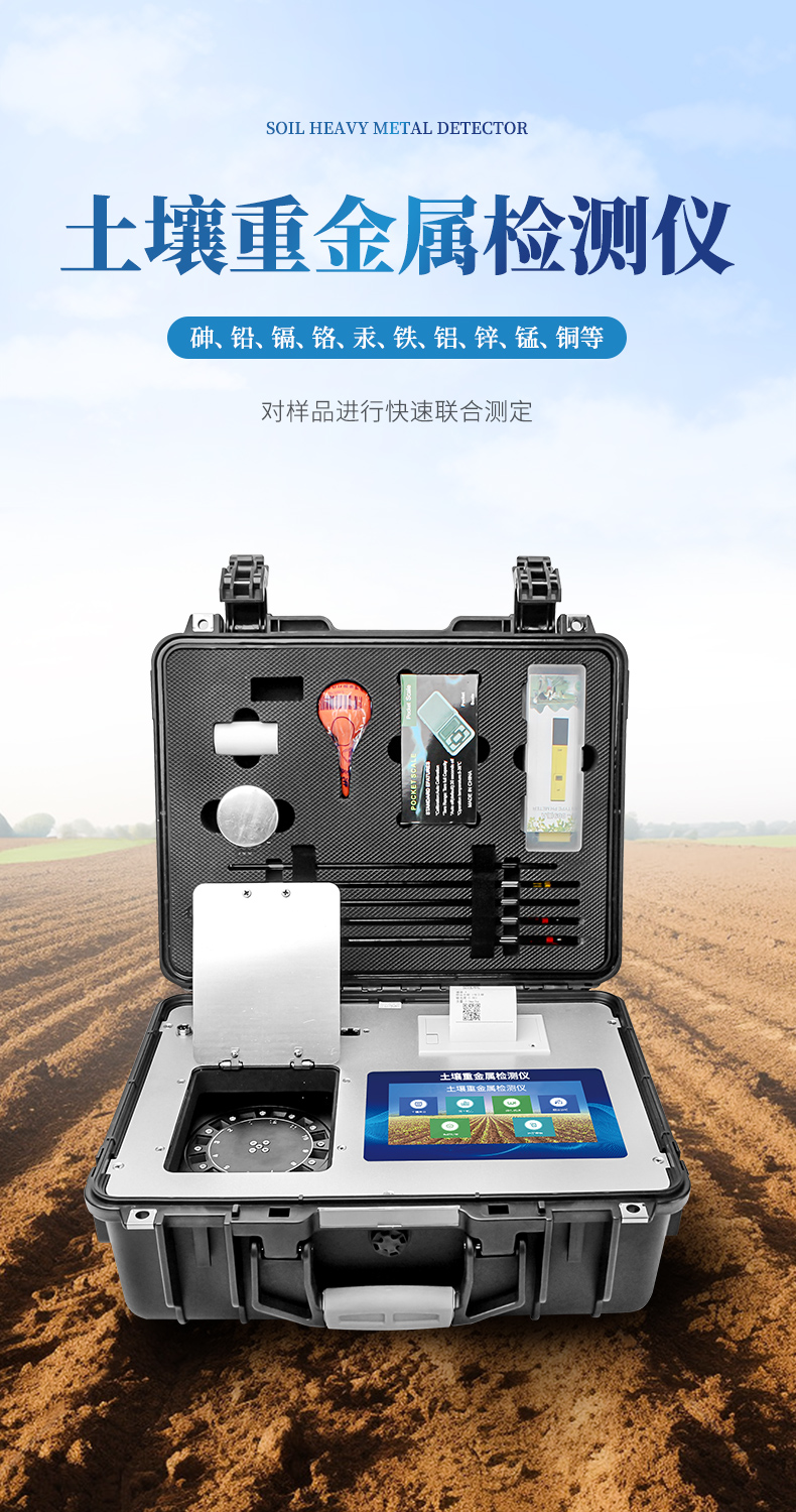 土壤重金屬污染問題日益嚴重,造成土壤耕作層內的鎘、銅、砷、鉻、汞、鐵、鋅、錳、銅、鋁等重金屬大量富積、積累,成為當下面臨的主要環(huán)境問題之一。土壤中的重金屬通過在作物體內富集進入食物鏈,對人畜健康造成嚴重威脅。有色金屬礦山的開采、 工業(yè)“三廢”的排放、含重金屬廢棄物堆積、農業(yè)生產中的污水灌溉,農用化學藥品的不合理使用等,都可能導致有害重金屬元素直接或間接進入土壤,導致土壤、作物、果蔬、水質、水產品等重金屬含量嚴重超標。但是當前重金屬測定方法測定速度慢、步驟繁瑣且儀器昂貴。基于這種形勢,我們開發(fā)出了重金屬快速測定方法。