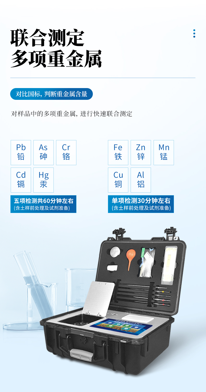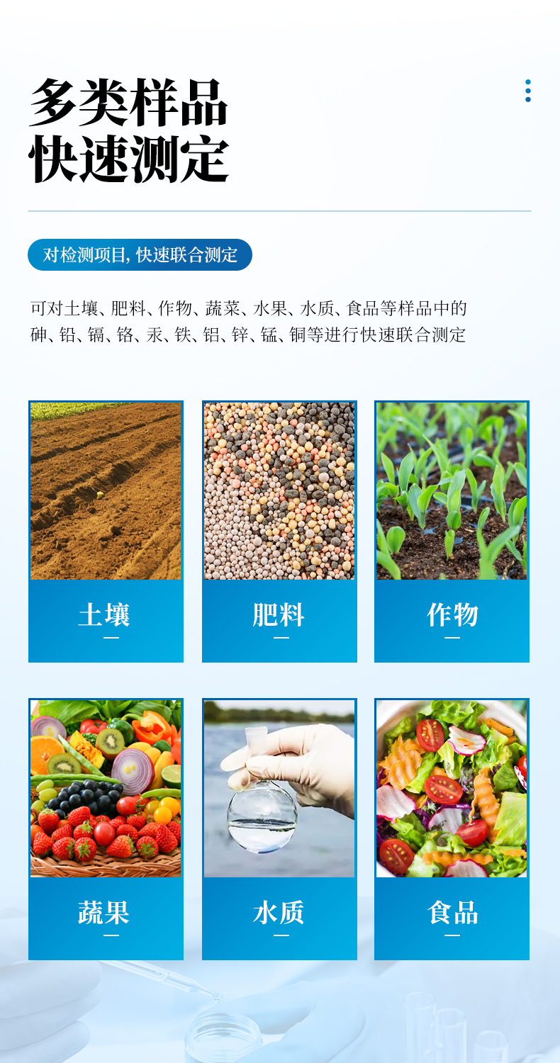 可對土壤、肥料、作物、蔬菜、水果、水質、食品等樣品中的砷、鉛、鎘、鉻、汞、鐵、鋁、鋅、錳、銅等進行快速聯(lián)合測定。