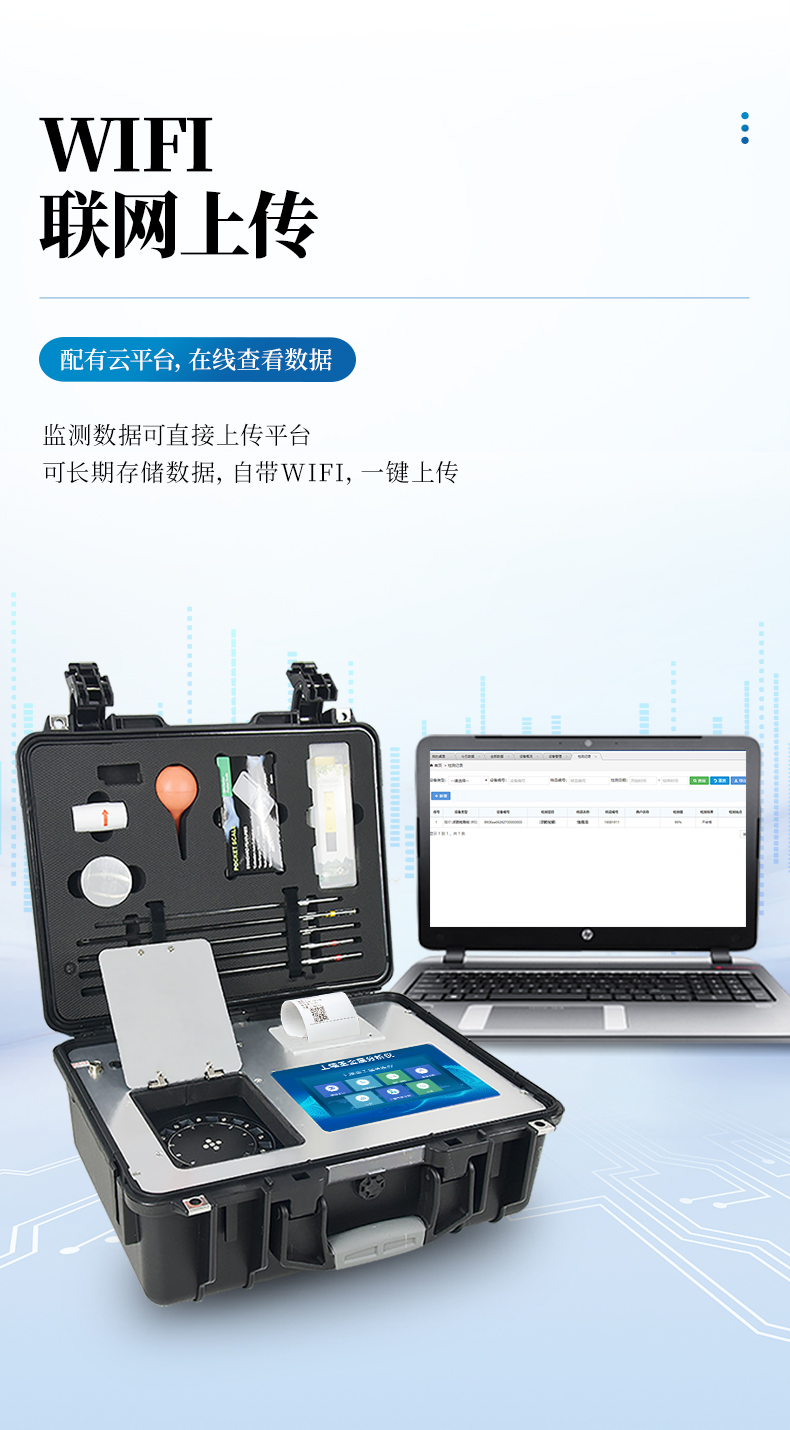 6、配有云平臺,儀器連入無線網(wǎng)絡后,可將檢測數(shù)據(jù)可選擇性或批量無線上傳,方便用戶進行長期數(shù)據(jù)管理和可視化分析。