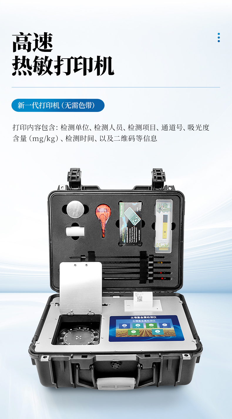 12、內置新一代高速熱敏打印機(無需色帶),打印內容包含:檢測單位、檢測人員、檢測項目、通道號、吸光度、含量(mg/kg)、檢測時間、以及二維碼等信息